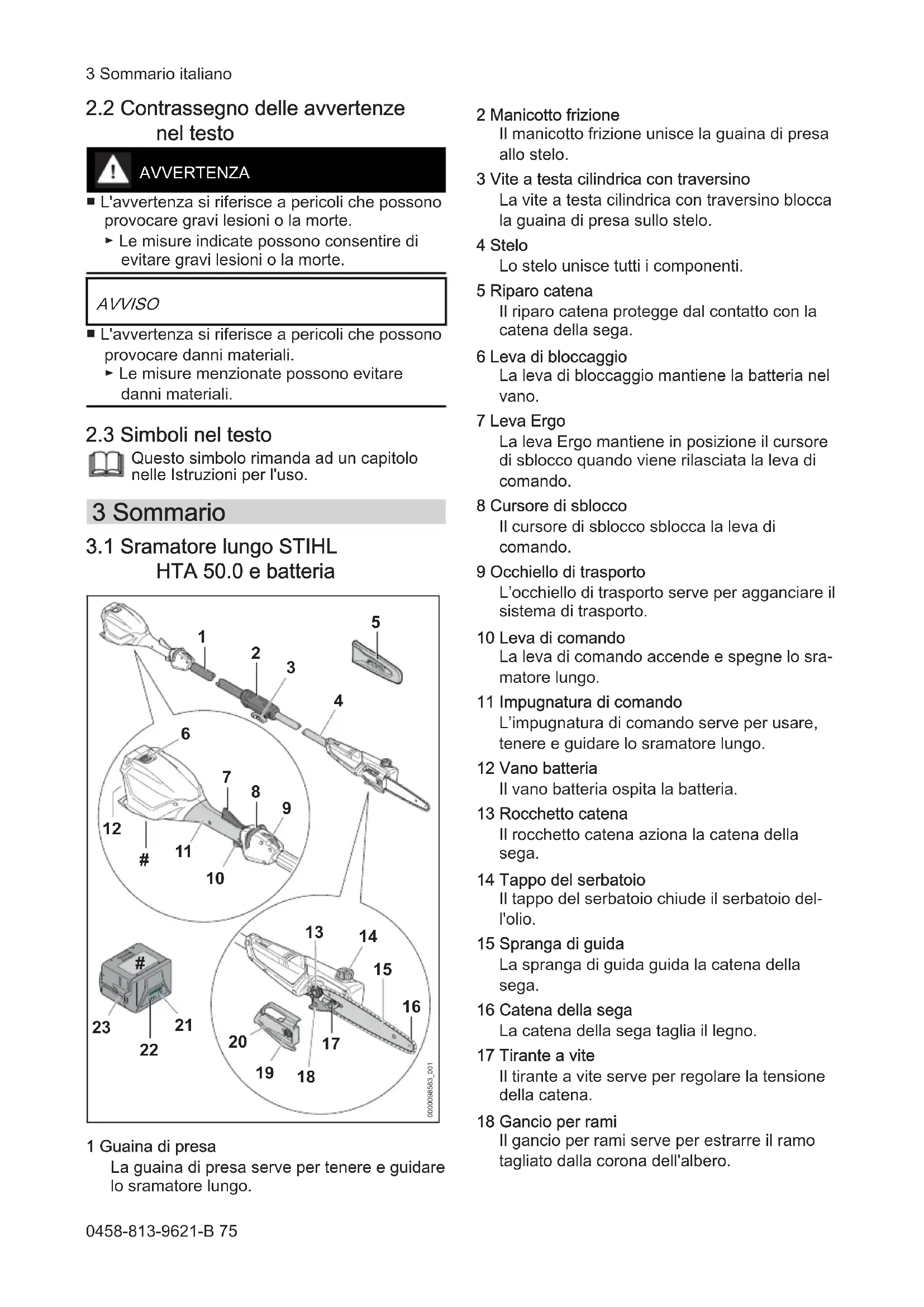 0000098563_001 1 Guaina di presa La guaina di presa serve per tenere e guidare lo sramatore lungo. 2 Manicotto frizione Il manicotto frizione unisce la guaina di presa allo stelo. 3 Vite a testa cilindrica con traversino La vite a testa cilindrica con traversino blocca la guaina di presa sullo stelo. 4 Stelo Lo stelo unisce tutti i componenti. 5 Riparo catena Il riparo catena protegge dal contatto con la catena della sega. 6 Leva di bloccaggio La leva di bloccaggio mantiene la batteria nel vano. 7 Leva Ergo La leva Ergo mantiene in posizione il cursore di sblocco quando viene rilasciata la leva di comando. 8 Cursore di sblocco Il cursore di sblocco sblocca la leva di comando. 9 Occhiello di trasporto L’occhiello di trasporto serve per agganciare il sistema di trasporto. 10 Leva di comando La leva di comando accende e spegne lo sra‐ matore lungo. 11 Impugnatura di comando L’impugnatura di comando serve per usare, tenere e guidare lo sramatore lungo. 12 Vano batteria Il vano batteria ospita la batteria. 13 Rocchetto catena Il rocchetto catena aziona la catena della sega. 14 Tappo del serbatoio Il tappo del serbatoio chiude il serbatoio del‐ l'olio. 15 Spranga di guida La spranga di guida guida la catena della sega. 16 Catena della sega La catena della sega taglia il legno. 17 Tirante a vite Il tirante a vite serve per regolare la tensione della catena. 18 Gancio per rami Il gancio per rami serve per estrarre il ramo tagliato dalla corona dell'albero. 3 Sommario italiano 0458-813-9621-B 7519 Dado Il dado fissa il coperchio rocchetto catena allo sramatore lungo. 20 Coperchio rocchetto catena Il coperchio rocchetto catena copre il roc‐ chetto catena e fissa la spranga di guida allo sramatore lungo. 21 Pulsante Il pulsante attiva i LED sulla batteria. 22 LED I LED indicano lo stato di carica della batteria e le anomalie. 23 Batteria La batteria alimenta di energia lo sramatore lungo. # Targhetta dati prestazioni con numero di macchina