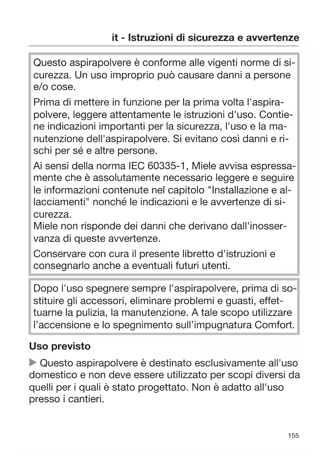 Questo aspirapolvere è conforme alle vigenti norme di si- curezza. Un uso improprio può causare danni a persone e/o cose. Prima di mettere in funzione per la prima volta l'aspira- polvere, leggere attentamente le istruzioni d'uso. Contie- ne indicazioni importanti per la sicurezza, l'uso e la ma- nutenzione dell'aspirapolvere. Si evitano così danni e ri- schi per sé e altre persone. Ai sensi della norma IEC 60335-1, Miele avvisa espressa- mente che è assolutamente necessario leggere e seguire le informazioni contenute nel capitolo "Installazione e al- lacciamenti" nonché le indicazioni e le avvertenze di si- curezza. Miele non risponde dei danni che derivano dall'inosser- vanza di queste avvertenze. Conservare con cura il presente libretto d'istruzioni e consegnarlo anche a eventuali futuri utenti. Dopo l'uso spegnere sempre l'aspirapolvere, prima di so- stituire gli accessori, eliminare problemi e guasti, effet- tuarne la pulizia, la manutenzione. A tale scopo utilizzare l’accensione e lo spegnimento sull’impugnatura Comfort. Uso previsto Questo aspirapolvere è destinato esclusivamente all'uso domestico e non deve essere utilizzato per scopi diversi da quelli per i quali è stato progettato. Non è adatto all'uso presso i cantieri.it - Istruzioni di sicurezza e avvertenze