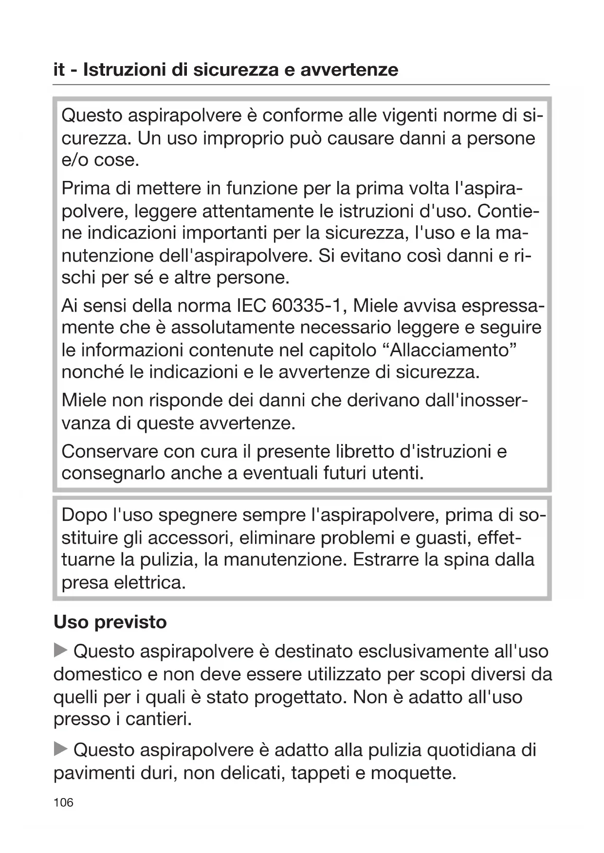 Questo aspirapolvere è conforme alle vigenti norme di si- curezza. Un uso improprio può causare danni a persone e/o cose. Prima di mettere in funzione per la prima volta l'aspira- polvere, leggere attentamente le istruzioni d'uso. Contie- ne indicazioni importanti per la sicurezza, l'uso e la ma- nutenzione dell'aspirapolvere. Si evitano così danni e ri- schi per sé e altre persone. Ai sensi della norma IEC 60335-1, Miele avvisa espressa- mente che è assolutamente necessario leggere e seguire le informazioni contenute nel capitolo “Allacciamento” nonché le indicazioni e le avvertenze di sicurezza. Miele non risponde dei danni che derivano dall'inosser- vanza di queste avvertenze. Conservare con cura il presente libretto d'istruzioni e consegnarlo anche a eventuali futuri utenti. Dopo l'uso spegnere sempre l'aspirapolvere, prima di so- stituire gli accessori, eliminare problemi e guasti, effet- tuarne la pulizia, la manutenzione. Estrarre la spina dalla presa elettrica. Uso previsto Questo aspirapolvere è destinato esclusivamente all'uso domestico e non deve essere utilizzato per scopi diversi da quelli per i quali è stato progettato. Non è adatto all'uso presso i cantieri. Questo aspirapolvere è adatto alla pulizia quotidiana di pavimenti duri, non delicati, tappeti e moquette.it - Istruzioni di sicurezza e avvertenze