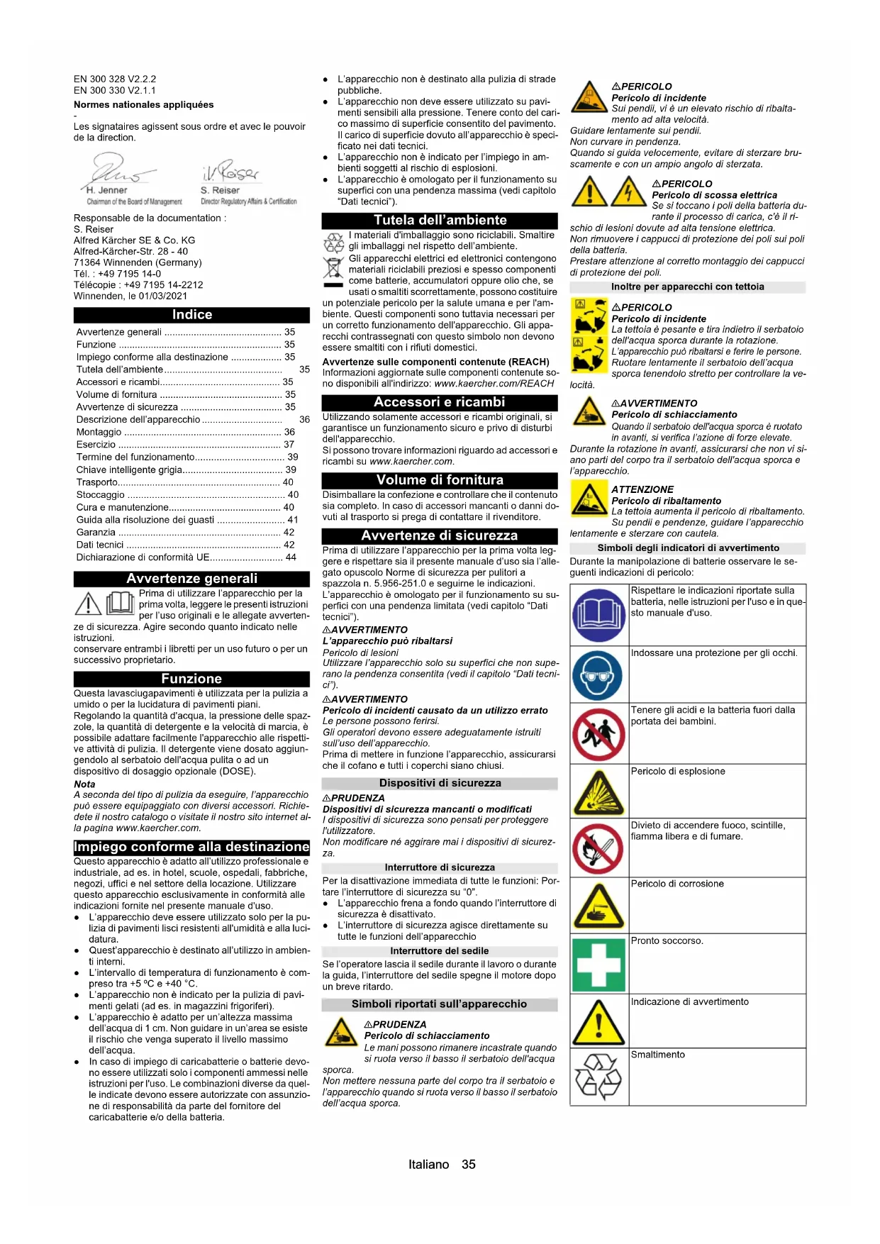 - Les signataires agissent sous ordre et avec le pouvoir de la direction. Responsable de la documentation : S. Reiser Alfred Kärcher SE & Co. KG Alfred-Kärcher-Str. 28 - 40 71364 Winnenden (Germany) Tél. : +49 7195 14-0 Télécopie : +49 7195 14-2212 Winnenden, le 01/03/2021 Indice Avvertenze generali Prima di utilizzare l’apparecchio per la prima volta, leggere le presenti istruzioni per l’uso originali e le allegate avverten- ze di sicurezza. Agire secondo quanto indicato nelle istruzioni. conservare entrambi i libretti per un uso futuro o per un successivo proprietario. Funzione Questa lavasciugapavimenti è utilizzata per la pulizia a umido o per la lucidatura di pavimenti piani. Regolando la quantità d'acqua, la pressione delle spaz- zole, la quantità di detergente e la velocità di marcia, è possibile adattare facilmente l'apparecchio alle rispetti- ve attività di pulizia. Il detergente viene dosato aggiun- gendolo al serbatoio dell'acqua pulita o ad un dispositivo di dosaggio opzionale (DOSE). Nota A seconda del tipo di pulizia da eseguire, l’apparecchio può essere equipaggiato con diversi accessori. Richie- dete il nostro catalogo o visitate il nostro sito internet al- la pagina www.kaercher.com. Impiego conforme alla destinazione Questo apparecchio è adatto all’utilizzo professionale e industriale, ad es. in hotel, scuole, ospedali, fabbriche, negozi, uffici e nel settore della locazione. Utilizzare questo apparecchio esclusivamente in conformità alle indicazioni fornite nel presente manuale d'uso. ● L’apparecchio deve essere utilizzato solo per la pu- lizia di pavimenti lisci resistenti all'umidità e alla luci- datura. ● Quest’apparecchio è destinato all’utilizzo in ambien- ti interni. ● L’intervallo di temperatura di funzionamento è com- preso tra +5 ºC e +40 °C. ● L’apparecchio non è indicato per la pulizia di pavi- menti gelati (ad es. in magazzini frigoriferi). ● L’apparecchio è adatto per un’altezza massima dell’acqua di 1 cm. Non guidare in un’area se esiste il rischio che venga superato il livello massimo dell’acqua. ● In caso di impiego di caricabatterie o batterie devo- no essere utilizzati solo i componenti ammessi nelle istruzioni per l'uso. Le combinazioni diverse da quel- le indicate devono essere autorizzate con assunzio- ne di responsabilità da parte del fornitore del caricabatterie e/o della batteria. ● L’apparecchio non è destinato alla pulizia di strade pubbliche. ● L’apparecchio non deve essere utilizzato su pavi- menti sensibili alla pressione. Tenere conto del cari- co massimo di superficie consentito del pavimento. Il carico di superficie dovuto all’apparecchio è speci- ficato nei dati tecnici. ● L’apparecchio non è indicato per l’impiego in am- bienti soggetti al rischio di esplosioni. ● L’apparecchio è omologato per il funzionamento su superfici con una pendenza massima (vedi capitolo “Dati tecnici”). Tutela dell’ambiente I materiali d'imballaggio sono riciclabili. Smaltire gli imballaggi nel rispetto dell’ambiente. Gli apparecchi elettrici ed elettronici contengono materiali riciclabili preziosi e spesso componenti come batterie, accumulatori oppure olio che, se usati o smaltiti scorrettamente, possono costituire un potenziale pericolo per la salute umana e per l'am- biente. Questi componenti sono tuttavia necessari per un corretto funzionamento dell'apparecchio. Gli appa- recchi contrassegnati con questo simbolo non devono essere smaltiti con i rifiuti domestici. Avvertenze sulle componenti contenute (REACH) Informazioni aggiornate sulle componenti contenute so- no disponibili all'indirizzo: www.kaercher.com/REACH Accessori e ricambi Utilizzando solamente accessori e ricambi originali, si garantisce un funzionamento sicuro e privo di disturbi dell'apparecchio. Si possono trovare informazioni riguardo ad accessori e ricambi su www.kaercher.com. Volume di fornitura Disimballare la confezione e controllare che il contenuto sia completo. In caso di accessori mancanti o danni do- vuti al trasporto si prega di contattare il rivenditore. Avvertenze di sicurezza Prima di utilizzare l’apparecchio per la prima volta leg- gere e rispettare sia il presente manuale d’uso sia l’alle- gato opuscolo Norme di sicurezza per pulitori a spazzola n. 5.956-251.0 e seguirne le indicazioni. L’apparecchio è omologato per il funzionamento su su- perfici con una pendenza limitata (vedi capitolo “Dati tecnici”). 몇 AVVERTIMENTO L’apparecchio può ribaltarsi Pericolo di lesioni Utilizzare l’apparecchio solo su superfici che non supe- rano la pendenza consentita (vedi il capitolo “Dati tecni- ci”). 몇 AVVERTIMENTO Pericolo di incidenti causato da un utilizzo errato Le persone possono ferirsi. Gli operatori devono essere adeguatamente istruiti sull’uso dell’apparecchio. Prima di mettere in funzione l’apparecchio, assicurarsi che il cofano e tutti i coperchi siano chiusi. Dispositivi di sicurezza 몇 PRUDENZA Dispositivi di sicurezza mancanti o modificati I dispositivi di sicurezza sono pensati per proteggere l'utilizzatore. Non modificare né aggirare mai i dispositivi di sicurez- za. Interruttore di sicurezza Per la disattivazione immediata di tutte le funzioni: Por- tare l’interruttore di sicurezza su “0”. ● L’apparecchio frena a fondo quando l’interruttore di sicurezza è disattivato. ● L’interruttore di sicurezza agisce direttamente su tutte le funzioni dell’apparecchio Interruttore del sedile Se l’operatore lascia il sedile durante il lavoro o durante la guida, l’interruttore del sedile spegne il motore dopo un breve ritardo. Simboli riportati sull’apparecchio 몇PRUDENZA Pericolo di schiacciamento Le mani possono rimanere incastrate quando si ruota verso il basso il serbatoio dell'acqua sporca. Non mettere nessuna parte del corpo tra il serbatoio e l’apparecchio quando si ruota verso il basso il serbatoio dell’acqua sporca. PERICOLO