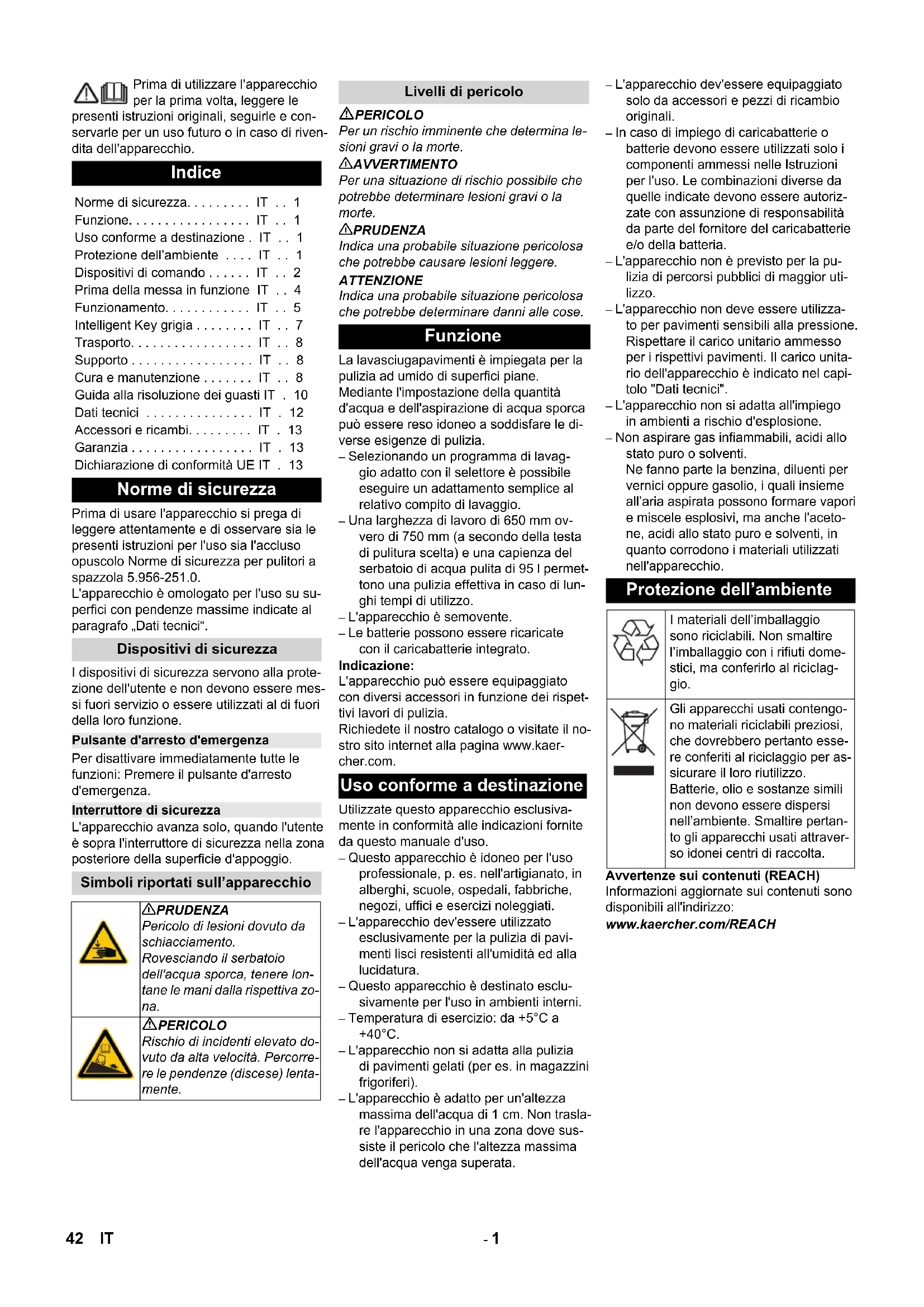 - Chairman of the Board of Management Director Regulatory Affairs & Certification 41FR- 1 Prima di utilizzare l'apparecchio per la prima volta, leggere le presenti istruzioni originali, seguirle e con- servarle per un uso futuro o in caso di riven- dita dell'apparecchio. Prima di usare l'apparecchio si prega di leggere attentamente e di osservare sia le presenti istruzioni per l'uso sia l'accluso opuscolo Norme di sicurezza per pulitori a spazzola 5.956-251.0. L'apparecchio è omologato per l'uso su su- perfici con pendenze massime indicate al paragrafo „Dati tecnici“. I dispositivi di sicurezza servono alla prote- zione dell'utente e non devono essere mes- si fuori servizio o essere utilizzati al di fuori della loro funzione. Per disattivare immediatamente tutte le funzioni: Premere il pulsante d'arresto d'emergenza. L'apparecchio avanza solo, quando l'utente è sopra l'interruttore di sicurezza nella zona posteriore della superficie d'appoggio. PERICOLO Per un rischio imminente che determina le- sioni gravi o la morte. 몇 AVVERTIMENTO Per una situazione di rischio possibile che potrebbe determinare lesioni gravi o la morte. 몇 PRUDENZA Indica una probabile situazione pericolosa che potrebbe causare lesioni leggere. ATTENZIONE Indica una probabile situazione pericolosa che potrebbe determinare danni alle cose. La lavasciugapavimenti è impiegata per la pulizia ad umido di superfici piane. Mediante l'impostazione della quantità d'acqua e dell'aspirazione di acqua sporca può essere reso idoneo a soddisfare le di- verse esigenze di pulizia. – Selezionando un programma di lavag- gio adatto con il selettore è possibile eseguire un adattamento semplice al relativo compito di lavaggio. – Una larghezza di lavoro di 650 mm ov- vero di 750 mm (a secondo della testa di pulitura scelta) e una capienza del serbatoio di acqua pulita di 95 l permet- tono una pulizia effettiva in caso di lun- ghi tempi di utilizzo. – L'apparecchio è semovente. – Le batterie possono essere ricaricate con il caricabatterie integrato. Indicazione: L'apparecchio può essere equipaggiato con diversi accessori in funzione dei rispet- tivi lavori di pulizia. Richiedete il nostro catalogo o visitate il no- stro sito internet alla pagina www.kaer- cher.com. Utilizzate questo apparecchio esclusiva- mente in conformità alle indicazioni fornite da questo manuale d'uso. – Questo apparecchio è idoneo per l'uso professionale, p. es. nell'artigianato, in alberghi, scuole, ospedali, fabbriche, negozi, uffici e esercizi noleggiati. – L'apparecchio dev'essere utilizzato esclusivamente per la pulizia di pavi- menti lisci resistenti all'umidità ed alla lucidatura. – Questo apparecchio è destinato esclu- sivamente per l'uso in ambienti interni. – Temperatura di esercizio: da +5°C a +40°C. – L'apparecchio non si adatta alla pulizia di pavimenti gelati (per es. in magazzini frigoriferi). – L'apparecchio è adatto per un'altezza massima dell'acqua di 1 cm. Non trasla- re l'apparecchio in una zona dove sus- siste il pericolo che l'altezza massima dell'acqua venga superata. – L'apparecchio dev'essere equipaggiato solo da accessori e pezzi di ricambio originali. – In caso di impiego di caricabatterie o batterie devono essere utilizzati solo i componenti ammessi nelle Istruzioni per l'uso. Le combinazioni diverse da quelle indicate devono essere autoriz- zate con assunzione di responsabilità da parte del fornitore del caricabatterie e/o della batteria. – L'apparecchio non è previsto per la pu- lizia di percorsi pubblici di maggior uti- lizzo. – L'apparecchio non deve essere utilizza- to per pavimenti sensibili alla pressione. Rispettare il carico unitario ammesso per i rispettivi pavimenti. Il carico unita- rio dell'apparecchio è indicato nel capi- tolo "Dati tecnici". – L'apparecchio non si adatta all'impiego in ambienti a rischio d'esplosione. – Non aspirare gas infiammabili, acidi allo stato puro o solventi. Ne fanno parte la benzina, diluenti per vernici oppure gasolio, i quali insieme all’aria aspirata possono formare vapori e miscele esplosivi, ma anche l'aceto- ne, acidi allo stato puro e solventi, in quanto corrodono i materiali utilizzati nell'apparecchio. Avvertenze sui contenuti (REACH) Informazioni aggiornate sui contenuti sono disponibili all'indirizzo: www.kaercher.com/REACH Indice Norme di sicurezza