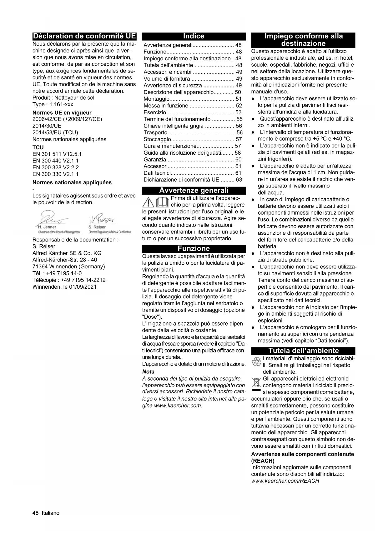 - Les signataires agissent sous ordre et avec le pouvoir de la direction. Responsable de la documentation : S. Reiser Alfred Kärcher SE & Co. KG Alfred-Kärcher-Str. 28 - 40 71364 Winnenden (Germany) Tél. : +49 7195 14-0 Télécopie : +49 7195 14-2212 Winnenden, le 01/09/2021 Indice Avvertenze generali Prima di utilizzare l’apparec- chio per la prima volta, leggere le presenti istruzioni per l’uso originali e le allegate avvertenze di sicurezza. Agire se- condo quanto indicato nelle istruzioni. conservare entrambi i libretti per un uso fu- turo o per un successivo proprietario. Funzione Questa lavasciugapavimenti è utilizzata per la pulizia a umido o per la lucidatura di pa- vimenti piani. Regolando la quantità d'acqua e la quantità di detergente è possibile adattare facilmen- te l'apparecchio alle rispettive attività di pu- lizia. Il dosaggio del detergente viene regolato tramite l’aggiunta nel serbatoio o tramite un dispositivo di dosaggio (opzione "Dose"). L’irrigazione a spazzola può essere dipen- dente dalla velocità o costante. La larghezza di lavoro e la capacità dei serbatoi di acqua fresca e sporca (vedere il capitolo "Da- ti tecnici") consentono una pulizia efficace con una lunga durata. L'apparecchio è dotato di un motore di trazione. Nota A seconda del tipo di pulizia da eseguire, l’apparecchio può essere equipaggiato con diversi accessori. Richiedete il nostro cata- logo o visitate il nostro sito internet alla pa- gina www.kaercher.com. Impiego conforme alla destinazione Questo apparecchio è adatto all’utilizzo professionale e industriale, ad es. in hotel, scuole, ospedali, fabbriche, negozi, uffici e nel settore della locazione. Utilizzare que- sto apparecchio esclusivamente in confor- mità alle indicazioni fornite nel presente manuale d'uso. ● L’apparecchio deve essere utilizzato so- lo per la pulizia di pavimenti lisci resi- stenti all'umidità e alla lucidatura. ● Quest’apparecchio è destinato all’utiliz- zo in ambienti interni. ● L’intervallo di temperatura di funziona- mento è compreso tra +5 ºC e +40 °C. ● L’apparecchio non è indicato per la puli- zia di pavimenti gelati (ad es. in magaz- zini frigoriferi). ● L’apparecchio è adatto per un’altezza massima dell’acqua di 1 cm. Non guida- re in un’area se esiste il rischio che ven- ga superato il livello massimo dell’acqua. ● In caso di impiego di caricabatterie o batterie devono essere utilizzati solo i componenti ammessi nelle istruzioni per l'uso. Le combinazioni diverse da quelle indicate devono essere autorizzate con assunzione di responsabilità da parte del fornitore del caricabatterie e/o della batteria. ● L’apparecchio non è destinato alla puli- zia di strade pubbliche. ● L’apparecchio non deve essere utilizza- to su pavimenti sensibili alla pressione. Tenere conto del carico massimo di su- perficie consentito del pavimento. Il cari- co di superficie dovuto all’apparecchio è specificato nei dati tecnici. ● L’apparecchio non è indicato per l’impie- go in ambienti soggetti al rischio di esplosioni. ● L’apparecchio è omologato per il funzio- namento su superfici con una pendenza massima (vedi capitolo “Dati tecnici”). Tutela dell’ambiente I materiali d'imballaggio sono riciclabi- li. Smaltire gli imballaggi nel rispetto dell’ambiente. Gli apparecchi elettrici ed elettronici contengono materiali riciclabili prezio- si e spesso componenti come batterie, accumulatori oppure olio che, se usati o smaltiti scorrettamente, possono costituire un potenziale pericolo per la salute umana e per l'ambiente. Questi componenti sono tuttavia necessari per un corretto funziona- mento dell'apparecchio. Gli apparecchi contrassegnati con questo simbolo non de- vono essere smaltiti con i rifiuti domestici. Avvertenze sulle componenti contenute (REACH) Informazioni aggiornate sulle componenti contenute sono disponibili all'indirizzo: www.kaercher.com/REACH Avvertenze generali p. 48