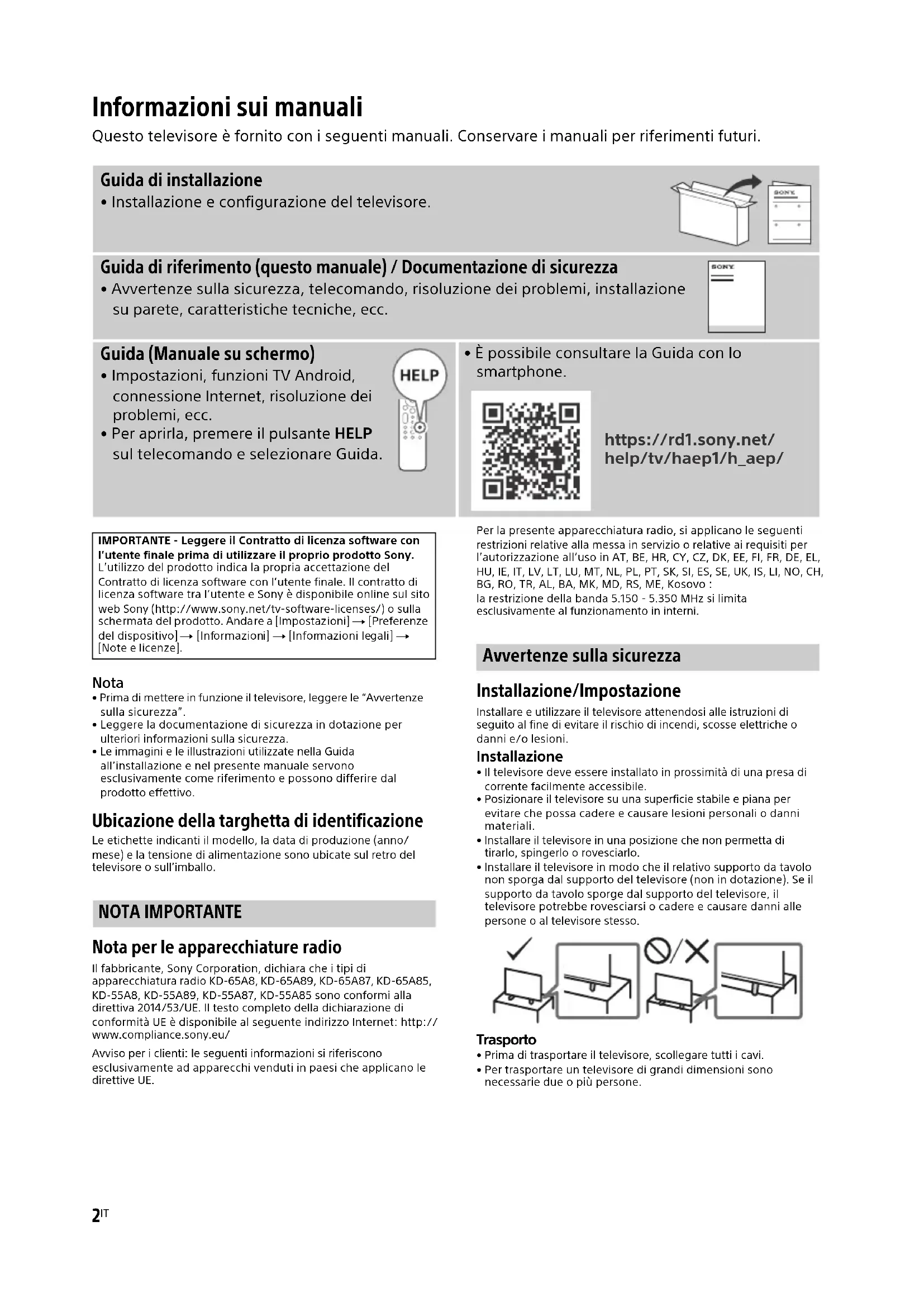 IMPORTANTE - Leggere il Contratto di licenza software con l'utente finale prima di utilizzare il proprio prodotto Sony. L'utilizzo del prodotto indica la propria accettazione del Contratto di licenza software con l'utente finale. Il contratto di licenza software tra l'utente e Sony è disponibile online sul sito web Sony (http://www.sony.net/tv-software-licenses/) o sulla schermata del prodotto. Andare a [Impostazioni] → [Preferenze del dispositivo] → [Informazioni] → [Informazioni legali] → [Note e licenze].