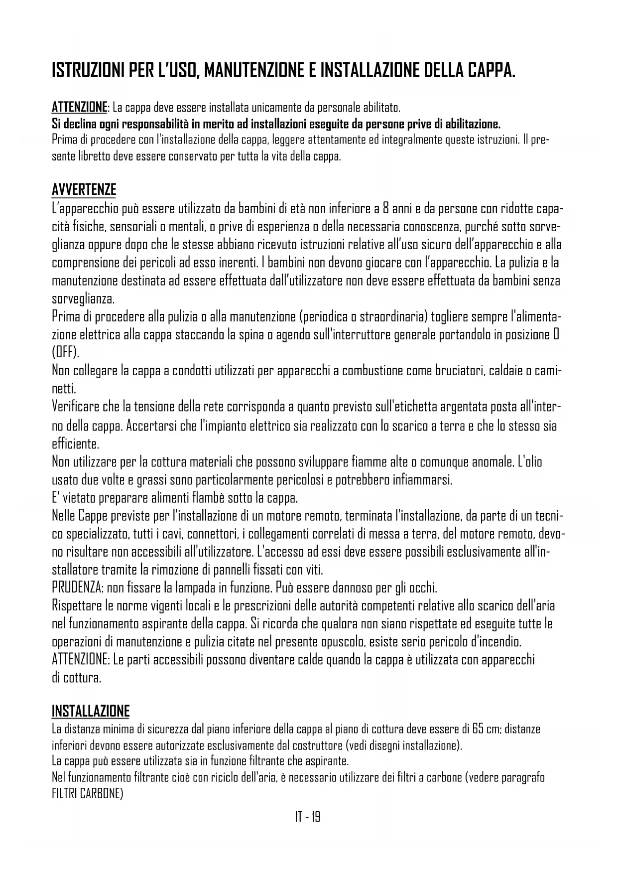 Attenzione: Prima di procedere con l’installazione, accertarsi che le viti e i tasselli forniti in dotazione, siano idonei per il tipo di parete in cui deve essere fissata la cappa. Per il montaggio della cappa utilizzare gli accessori in dotazione e seguire le fasi illustrate nel foglio allegato. ALLACCIAMENTO ELETTRICO L'allacciamento elettrico deve essere effettuato da personale specializzato, nel rispetto delle norme e leggi vigenti. Verificare che la tensione della rete corrisponda a quella indicata sull'etichetta argentata posta all'interno della cappa. Accertarsi che l'impianto sia realizzato secondo le norme vigenti e con lo scarico a terra efficiente. Porre particolare attenzione al cavo di alimentazione della cappa, verificando che non attraversi fori sprovvisti di passacavo. Nel caso di collegamento diretto alla rete, è necessario prevedere un dispositivo che assicuri la discon- nessione dalla rete, con una distanza di apertura dei contatti che consenta la disconnessione completa nelle condizio- ni della categoria di sovratensione III, conformemente alle regole di installazione. La spina o l'interruttore onnipolare devono essere accessibili ad apparecchio installato. Se il cavo di alimentazione è danneggiato, esso deve essere sostituito con un cavo speciale oppure un assieme disponibili presso il costruttore o il suo servizio assistenza tecni- ca. Il cavo da utilizzare deve essere di tipo H05VV-F con sezione minima 3 x 0,75mm². Il costruttore declina ogni responsabilità nel caso non vengano rispettate le norme antinfortunistiche vigenti, necessarie al regolare funzionamento dell'impianto elettrico. COMANDI COMANDO PUSH BOTTON (Fig. 1) Nella versione con comando pulsantiera sono presenti quattro pulsanti. > Un pulsante per accensione e spegnimento delle luci. > Un pulsante per accensione in 1^ velocità e spegnimento del motore. > Un pulsante per accensione 2^ velocità. > Un pulsante per accensione 3^ velocità.IT - 21 COMANDO SOFT TOUCH (Fig. 2) Nella versione con comando soft touch sono presenti quattro pulsanti a sfioramento ed un led a colore variabile (verde min. velocità, rosso max. velocità). > Un pulsante per accensione e spegnimento delle luci. > Un pulsante per accensione in 2^ velocità e spegnimento del motore. N.B. Tenendo premuto questo tasto per più di tre secondi, si attiva la funzione di autospegnimento dopo 10 minuti, il led lampeggia lentamente. > Due pulsanti + e - per aumento e riduzione delle velocità motore. Alla 4^ velocità del motore (intensiva) il led lam- peggia velocemente e dopo 5min. viene impostata automaticamente la 2^ velocità. COMANDO DIGITALE \ TOUCH CONTROL (Fig. 3) Nella versione con comando digitale sono presenti cinque pulsanti a sfioramento ed un display. > Un pulsante per accensione e spegnimento delle luci. > Un pulsante per accensione in 2^ velocità e spegnimento del motore. > Due pulsanti + e - per aumento e riduzione delle velocità motore. Alla 4^ velocità del motore (intensiva) il numero presente nel display lampeggia e dopo 5min. viene impostata automaticamente la 2^ velocità. > Un pulsante TIMER per spegnimento del motore dopo 10 min. con il timer attivato, il numero presente nel display sarà lampeggiante Funzioni speciali: Dopo 100 ore di utilizzo sul DISPLAY inizierà a lampeggiare lo 0 oppure la lettera A per segnalare l'esigenza di lavare i filtri metallici. Dopo aver lavato i filtri metallici, azzerare il conta ore tenendo premuto il tasto TIMER per più di tre sec. con cappa spenta. La visualizzazione dell'avvenuto azzeramento viene segnalata mediante la comparsa, a cappa spenta, di un trattino sul display. COMANDO RADIO-CONTROL ( Fig. 4) Il tasto ON/OFF sulla cappa, accende simultaneamente le luci e il motore alla seconda velocità oppure spegne tutto. Dopo 100 ore di funzionamento del motore aspirante, inizierà a lampeggiare il led rosso a segnalare l’esigenza di lavare i filtri metallici. Per annullare l’allarme filtri, è necessario tenere premuto a lungo il tasto ON/OFF sulla cappa con motore spento. Telecomando ATTENZIONE: le cappe con il telecomando di serie sono già configurate. Per i telecomandi optional e/o in sostituzione è necessario avviare l’apprendimento: A cappa spenta, tenere premuto 5 sec. il tasto ON/OFF (DISTANTE - CEILING - EICOE22 - SKYFRAME) o il tasto “+” (AIDA - HAMLET - ROMEO) sulla cappa. L'apprendimento del telecomando viene segnalato con il led allarme rosso lampeg- giante. Se entro un minuto arriva un codice telecomando valido (inviato premendo qualunque tasto del telecomando), il led diventa acceso fisso per 3 secondi per poi spegnersi, segnalando il corretto apprendimento. Tasti telecomando: > Un tasto per accensione e spegnimento delle luci. CEILING PANEL: Tenere premuto il tasto per dimmerare la luce > Un tasto per accensione in 2^ velocità e spegnimento del motore. > Due tasti + e - per aumento e riduzione delle velocità motore. Alla 4^ velocità del motore (intensiva) il led lampeggia e dopo 5min. viene impostata automaticamente la 2^ velocità. > Un tasto TIMER per spegnimento del motore dopo 10 min.IT - 22