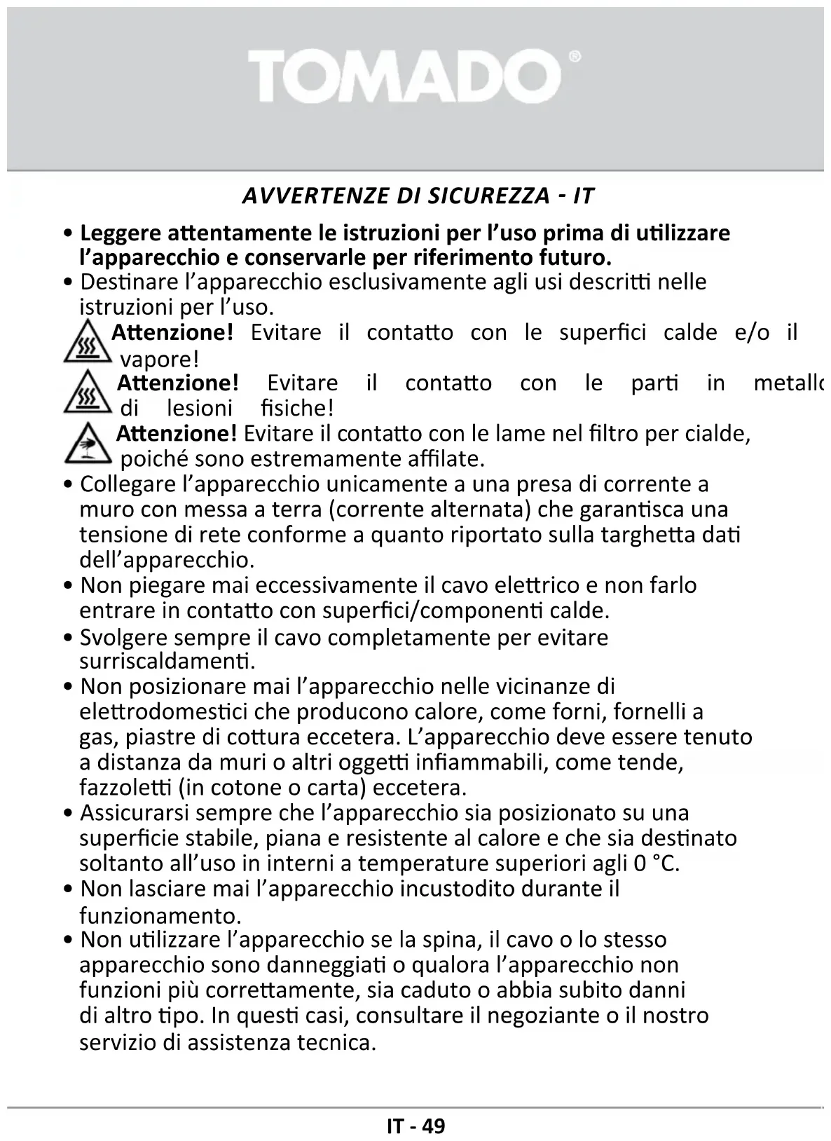 - Non ulizzare l’apparecchio se la spina, il cavo o lo stesso apparecchio sono danneggia o qualora l’apparecchio non funzioni più correamente, sia caduto o abbia subito danni di altro po. In ques casi, consultare il negoziante o il nostro servizio di assistenza tecnica.IT - 50