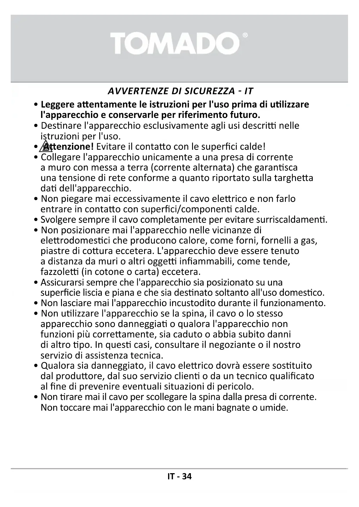 Su questo apparecchio vige una garanzia del produore di 24 mesi. La garanzia è valida soltanto qualora il prodoo sia stato ulizzato in conformità alle istruzioni per l'uso e desnato ai ni a cui è preposto. A un'eventuale richiesta, è inoltre necessario allegare la prova di acquisto originale recante la data di acquisto, il nome del venditore e il numero di arcolo del prodoo. Per ulteriori informazioni sulle condizioni di garanzia: www.tomado.com/support