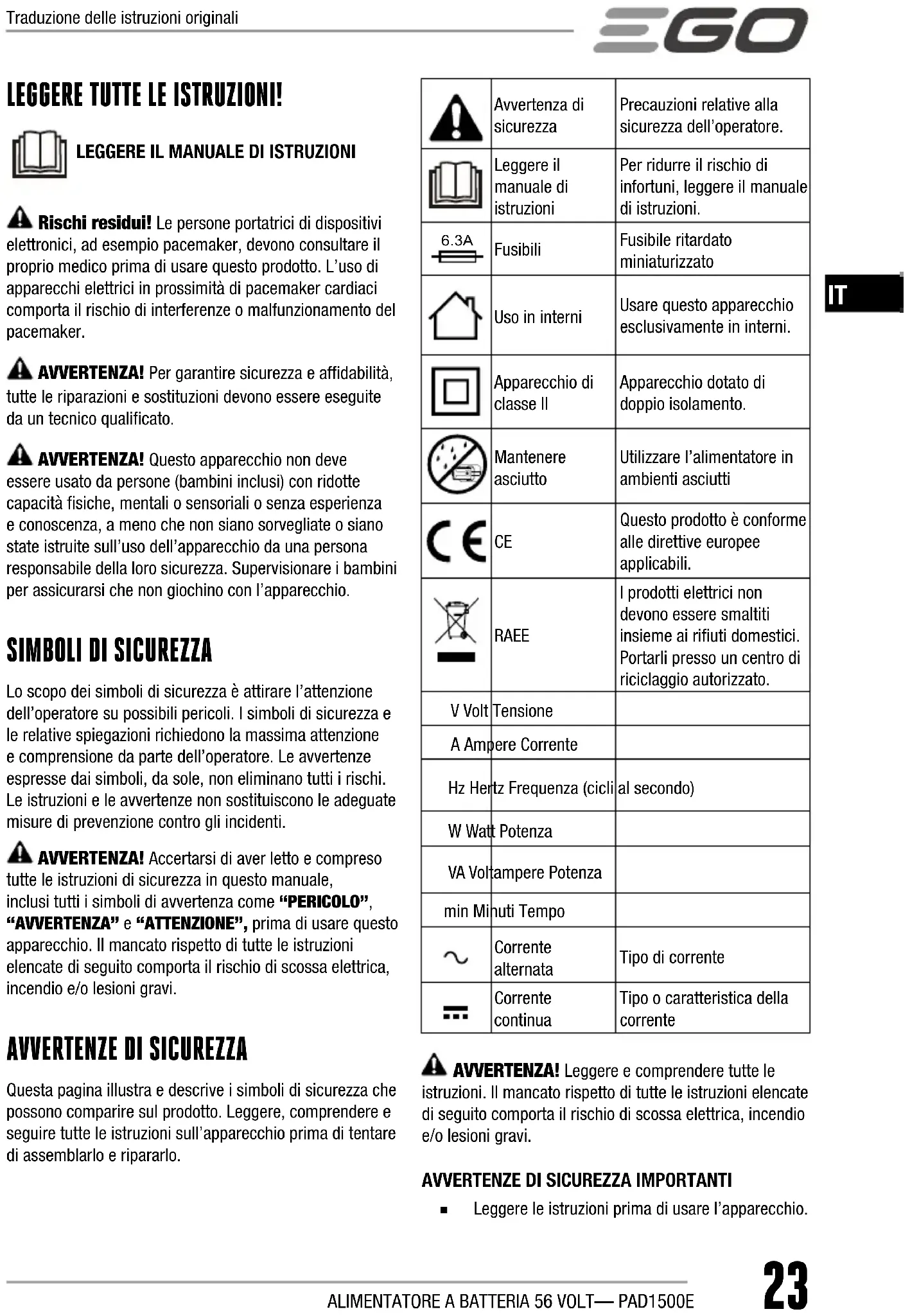 Scarica le istruzioni per il tuo Batteria in formato PDF gratuitamente! Trova il tuo manuale PAD1501E - EGO e riprendi in mano il tuo dispositivo elettronico. In questa pagina sono pubblicati tutti i documenti necessari per l'utilizzo del tuo dispositivo. PAD1501E del marchio EGO.