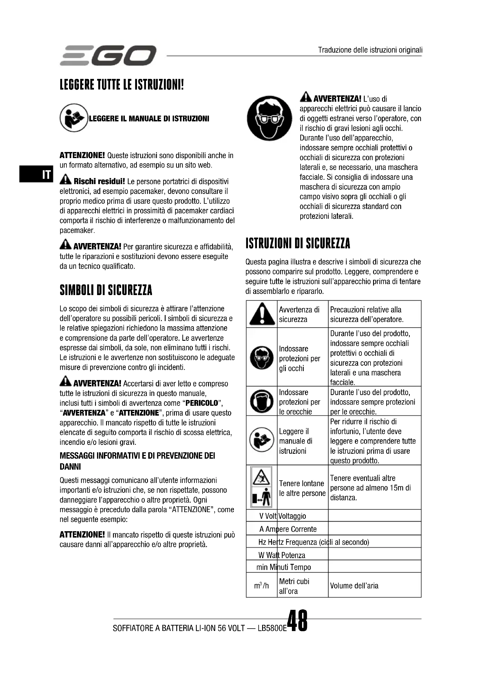 Metri cubi all’oraVolume dell’ariaTraduzione delle istruzioni originaliSOFFIATORE A BATTERIA LI-ION 56 VOLT — LB5800E