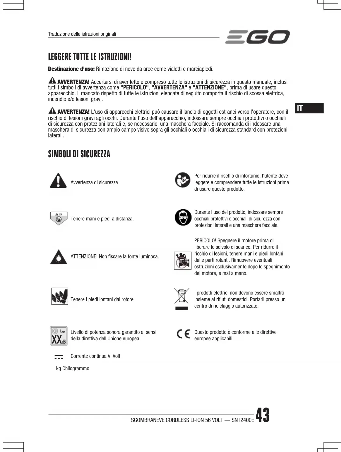 Livello di potenza sonora garantito ai sensi della direttiva dell'Unione europea.Questo prodotto è conforme alle direttive europee applicabili.Corrente continua V Voltkg ChilogrammoTraduzione delle istruzioni originaliSGOMBRANEVE CORDLESS LI-ION 56 VOLT — SNT2400E44