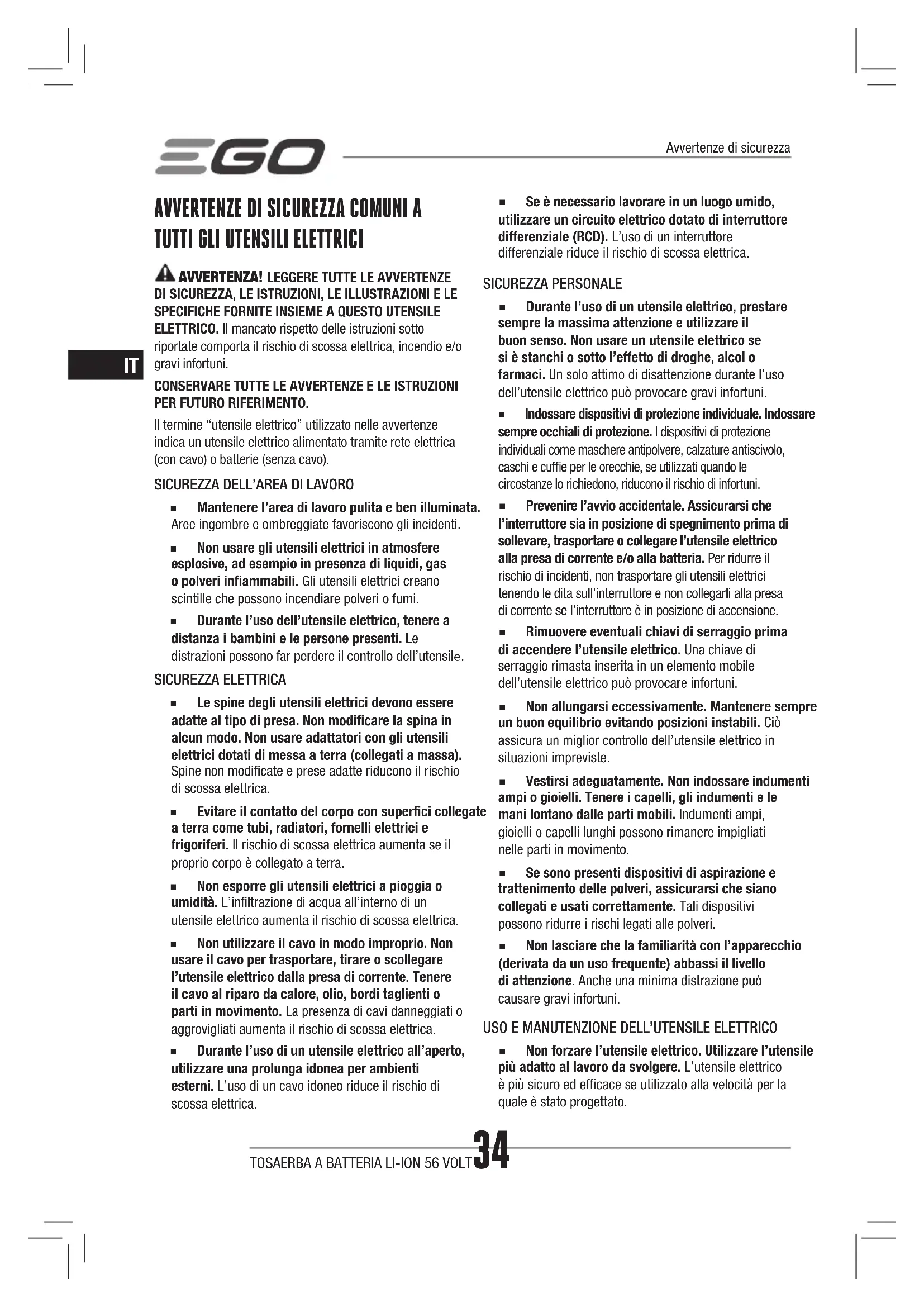 PERICOLO! Questo apparecchio è stata costruito per funzionare conformemente alle norme di sicurezza incluse in questo manuale. Come per tutti gli apparecchi elettrici, disattenzione o errori da parte dell'operatore comportano il rischio di lesioni gravi. Questo apparecchio comporta il rischio di lesioni a mani e piedi e di lancio di oggetti. Il mancato rispetto di tutte le istruzioni di sicurezza comporta il rischio di lesioni gravi o mortali. AVVERTENZA! Durante l'uso dei tosaerba a batteria è necessario rispettare alcune elementari norme di sicurezza per ridurre il rischio di incendio, scossa elettrica e infortunio.TOSAERBA A BATTERIA LI-ION 56 VOLT36