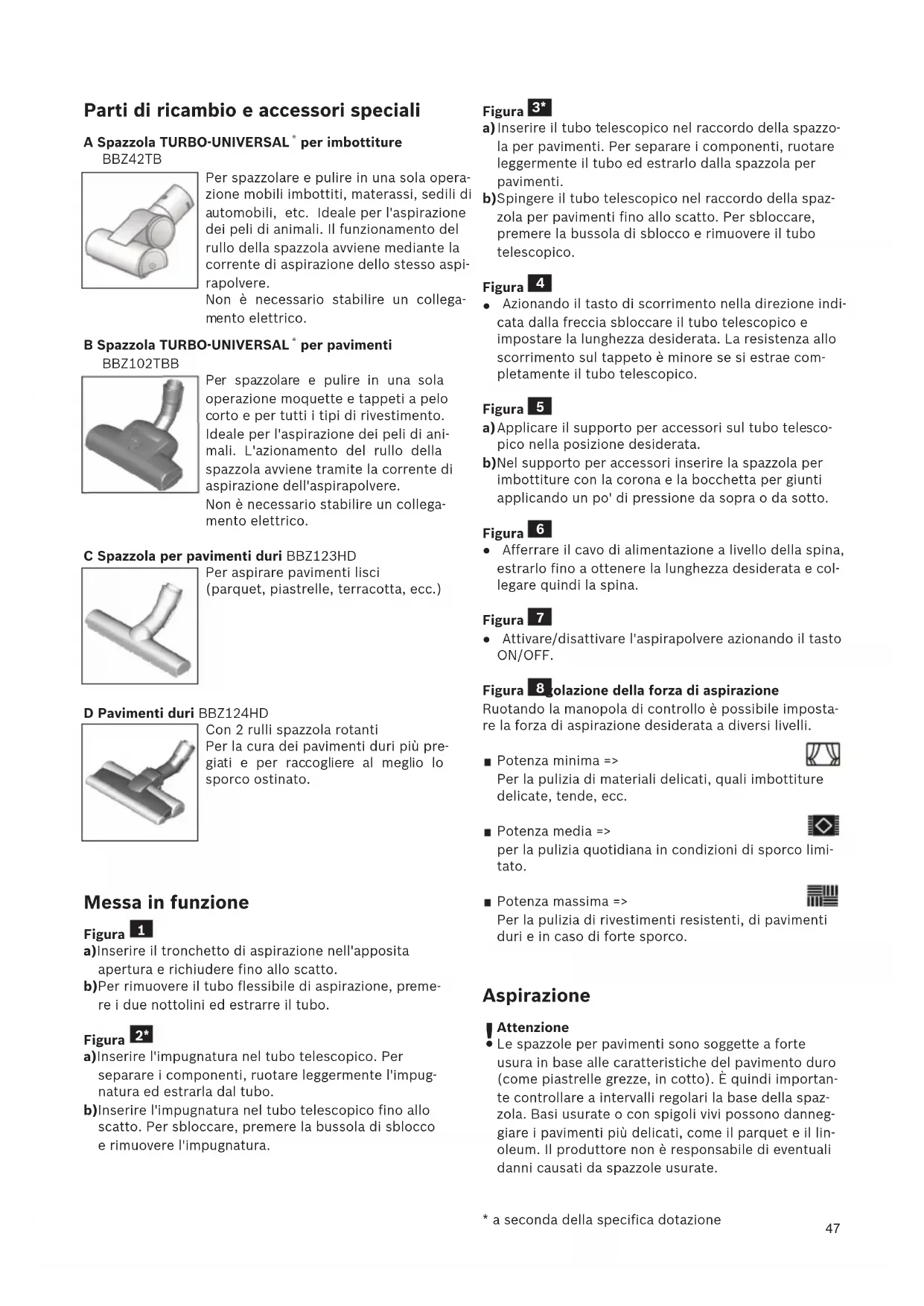 orto e per tutti i tipi di rivestimento. Ideale per l'aspirazione dei peli di ani- mali. L'azionamento del rullo della spazzola avviene tramite la corrente di aspirazione dell'aspirapolvere. Non è necessario stabilire un collega- mento elettrico. C Spazzola per pavimenti duri BBZ123HD Per aspirare pavimenti lisci (parquet, piastrelle, terracotta, ecc.) D Pavimenti duri BBZ124HD Con 2 rulli spazzola rotanti Per la cura dei pavimenti duri più pre- giati e per raccogliere al meglio lo sporco ostinato. Messa in funzione Figura a)Inserire il tronchetto di aspirazione nell'apposita apertura e richiudere fino allo scatto. b)Per rimuovere il tubo flessibile di aspirazione, preme- re i due nottolini ed estrarre il tubo. Figura a)Inserire l'impugnatura nel tubo telescopico. Per separare i componenti, ruotare leggermente l'impug- natura ed estrarla dal tubo. b)Inserire l'impugnatura nel tubo telescopico fino allo scatto. Per sbloccare, premere la bussola di sblocco e rimuovere l'impugnatura.