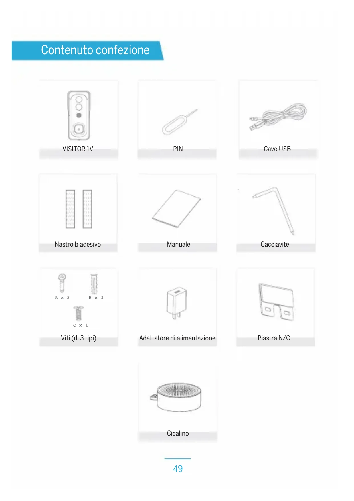 POCE191029066TRS Radio ETSI EN 300 328 V2.2.2 POCE191029059QRW Salud EN 62311:2008 POCE191029058NRW Seguridad EN 62368-1:2014+A11:2017 POCE191029066TRS Da fe: Reinhard Handlgruber, Director de operaciones Peuerbach, 20/06/2020VISITOR 1V Manuale Smart H me49 Contenuto confezione VISITOR 1V Nastro biadesivo A x 3 B x 3 C x 1 Viti (di 3 tipi) Cicalino PIN Manuale Adattatore di alimentazione Cavo USB Cacciavite Piastra N/C50 Attenzione Si prega di osservare le disposizionie sulla protezione dei dati - Regolamento di base UE (DSGVO). Le leggi sulla sorveglianza e la protezione dei dati variano a seconda della giurisdizione. Prima di utilizzare questo prodotto, verificare tutte le leggi pertinenti nella propria giurisdizione per assicurarsi che l‘utilizzo non violi le leggi applicabili La società Bea-fon Mobile GmbH non si assume alcuna responsabilità per eventuali conseguenze derivanti dall‘uso.51 Descrizione Porta di alimentazione CC 5 V +/- 10% Pulsante campanello Premere il pulsante per attivare il campanello Indicatore di stato • Luce rossa accesa: anomalie nella rete della telecamera
