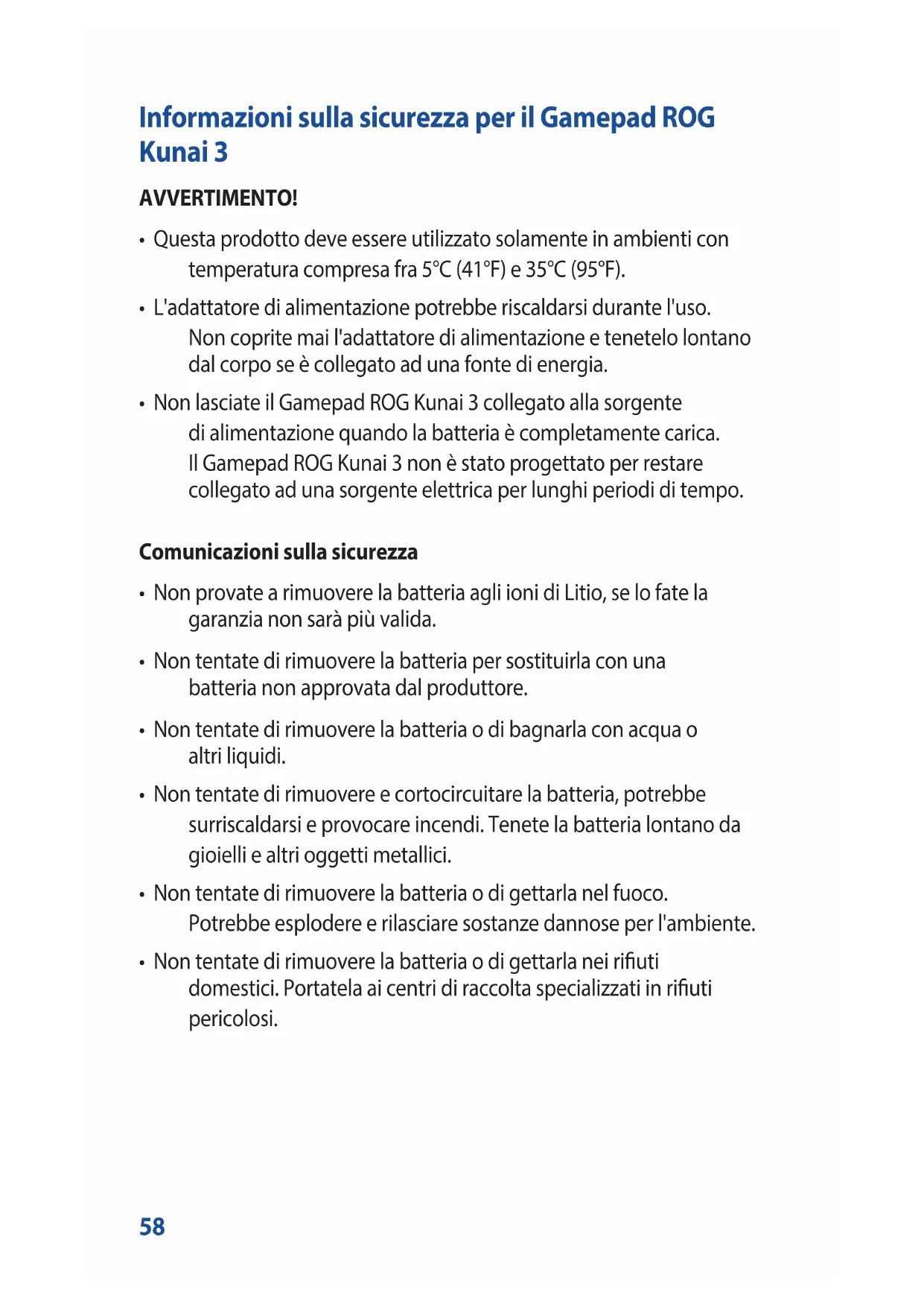 - Non lasciate il Gamepad ROG Kunai 3 collegato alla sorgente di alimentazione quando la batteria è completamente carica. Il Gamepad ROG Kunai 3 non è stato progettato per restare collegato ad una sorgente elettrica per lunghi periodi di tempo. Comunicazioni sulla sicurezza