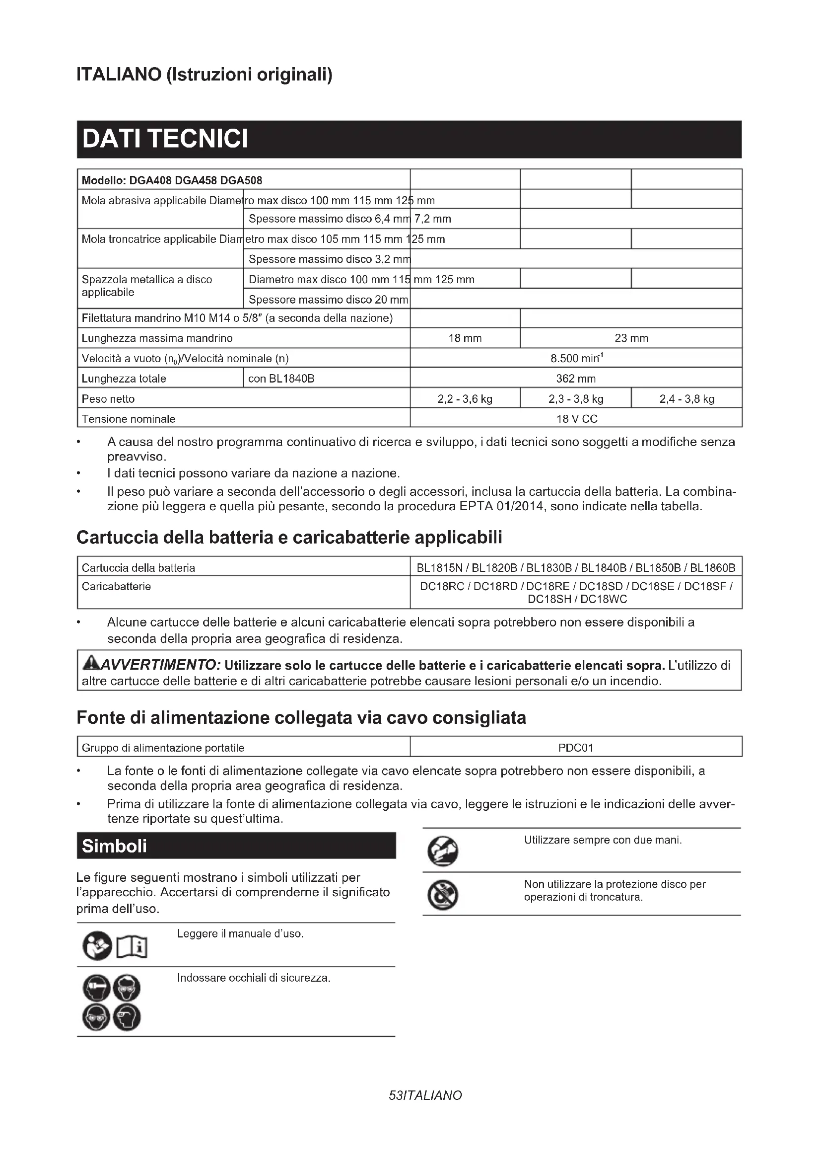DGA408 2,5 m/s o inferiore 1,5DGA458 2,5 m/s o inferiore 1,5DGA508 2,5 m/s o inferiore 1,5 NOTA: Il valore o i valori complessivi delle vibrazioni dichiarati sono stati misurati in conformità a un metodo stan- dard di verica, e possono essere utilizzati per confrontare un utensile con un altro. NOTA: Il valore o i valori complessivi delle vibrazioni dichiarati possono venire utilizzati anche per una valutazione preliminare dell’esposizione. AVVERTIMENTO: L’emissione delle vibrazioni durante l’utilizzo eettivo dell’utensile elettrico può variare rispetto al valore o ai valori dichiarati, a seconda dei modi in cui viene utilizzato l’utensile, special- mente a seconda di che tipo di pezzo venga lavorato. AVVERTIMENTO: Accertarsi di identicare misure di sicurezza per la protezione dell’operatore che siano basate su una stima dell’esposizione nelle condizioni eettive di utilizzo (tenendo conto di tutte le parti del ciclo operativo, ad esempio del numero di spegnimenti dell’utensile e di quando giri a vuoto, oltre al tempo di attivazione). AVVERTIMENTO: Il valore di emissione delle vibrazioni dichiarato viene utilizzato per le applicazioni prin- cipali dell’utensile elettrico. Tuttavia, qualora l’utensile elettrico venga utilizzato per altre applicazioni, il valore di emissione delle vibrazioni potrebbe essere diverso. Dichiarazione di conformità CE Solo per i paesi europei La dichiarazione di conformità CE è inclusa nell’Alle- gato A al presente manuale di istruzioni. AVVERTENZE DI SICUREZZA Avvertenze generali relative alla sicurezza dell’utensile elettrico AVVERTIMENTO Leggere tutte le avvertenze di sicurezza, le istruzioni, le illustrazioni e i dati tecnici forniti insieme a questo utensile elettrico. La man- cata osservanza di tutte le istruzioni seguenti potrebbe risultare in scosse elettriche, incendi e/o gravi lesioni personali. Conservare tutte le avvertenze e le istruzioni come riferimento futuro. Il termine “utensile elettrico” nelle avvertenze si riferisce sia all’utensile elettrico (cablato) nel funzionamento alimentato da rete elettrica che all’utensile elettrico (a batteria) nel funzionamento alimentato a batteria. Avvertenze di sicurezza relative alla smerigliatrice a batteria Avvertenze di sicurezza comuni relative alle opera- zioni di smerigliatura, carteggiatura, spazzolatura metallica o troncatura: