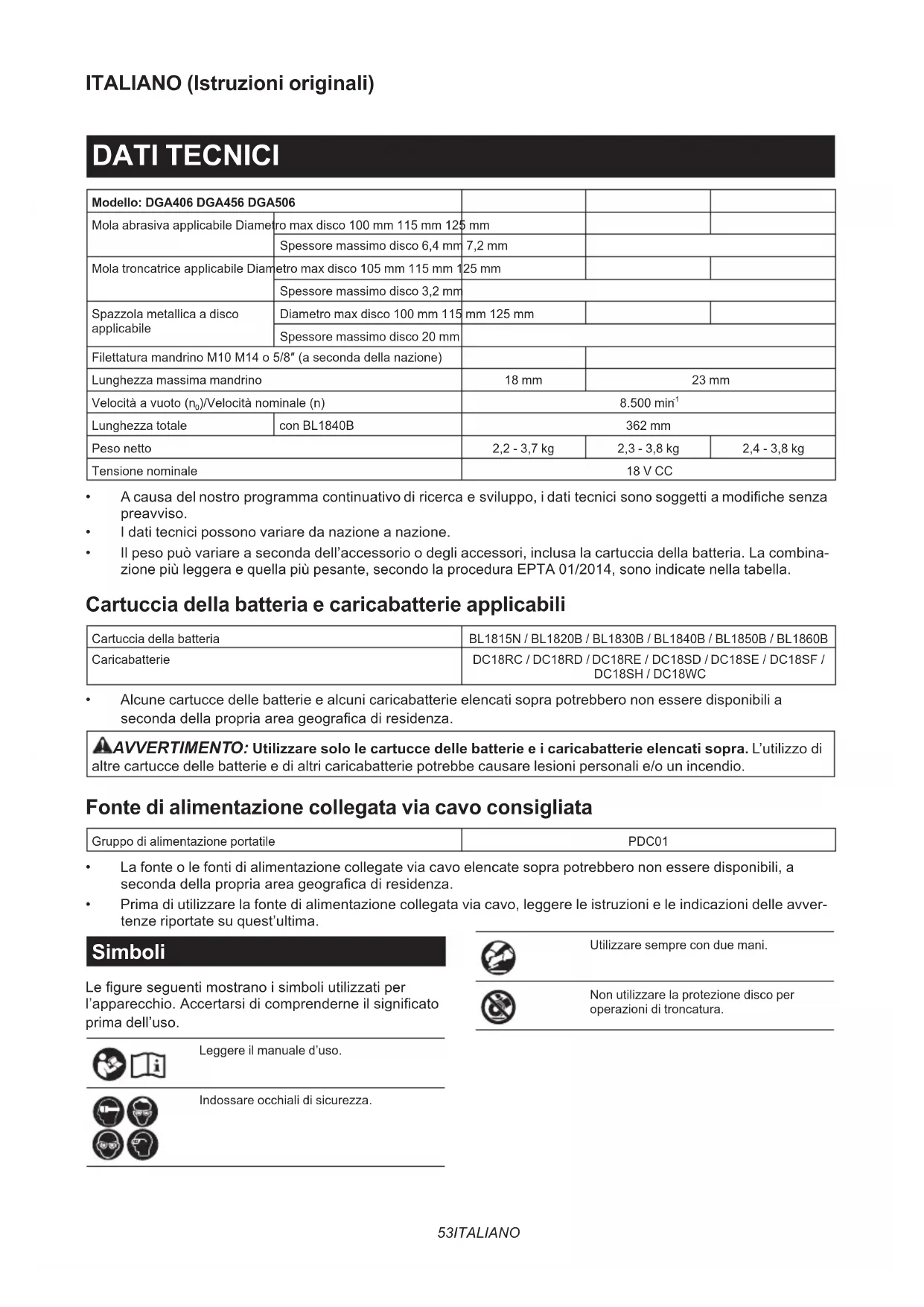 DGA406 2,5 m/s o inferiore 1,5DGA456 2,5 m/s o inferiore 1,5DGA506 2,5 m/s o inferiore 1,5 NOTA: Il valore o i valori complessivi delle vibrazioni dichiarati sono stati misurati in conformità a un metodo stan- dard di verica, e possono essere utilizzati per confrontare un utensile con un altro. NOTA: Il valore o i valori complessivi delle vibrazioni dichiarati possono venire utilizzati anche per una valutazione preliminare dell’esposizione. AVVERTIMENTO: L’emissione delle vibrazioni durante l’utilizzo eettivo dell’utensile elettrico può variare rispetto al valore o ai valori dichiarati, a seconda dei modi in cui viene utilizzato l’utensile, special- mente a seconda di che tipo di pezzo venga lavorato. AVVERTIMENTO: Accertarsi di identicare misure di sicurezza per la protezione dell’operatore che siano basate su una stima dell’esposizione nelle condizioni eettive di utilizzo (tenendo conto di tutte le parti del ciclo operativo, ad esempio del numero di spegnimenti dell’utensile e di quando giri a vuoto, oltre al tempo di attivazione). AVVERTIMENTO: Il valore di emissione delle vibrazioni dichiarato viene utilizzato per le applicazioni prin- cipali dell’utensile elettrico. Tuttavia, qualora l’utensile elettrico venga utilizzato per altre applicazioni, il valore di emissione delle vibrazioni potrebbe essere diverso. Dichiarazione di conformità CE Solo per i paesi europei La dichiarazione di conformità CE è inclusa nell’Alle- gato A al presente manuale di istruzioni. AVVERTENZE DI SICUREZZA Avvertenze generali relative alla sicurezza dell’utensile elettrico AVVERTIMENTO Leggere tutte le avvertenze di sicurezza, le istruzioni, le illustrazioni e i dati tecnici forniti insieme a questo utensile elettrico. La man- cata osservanza di tutte le istruzioni seguenti potrebbe risultare in scosse elettriche, incendi e/o gravi lesioni personali. Conservare tutte le avvertenze e le istruzioni come riferimento futuro. Il termine “utensile elettrico” nelle avvertenze si riferisce sia all’utensile elettrico (cablato) nel funzionamento alimentato da rete elettrica che all’utensile elettrico (a batteria) nel funzionamento alimentato a batteria. Avvertenze di sicurezza relative alla smerigliatrice a batteria Avvertenze di sicurezza comuni relative alle opera- zioni di smerigliatura, carteggiatura, spazzolatura metallica o troncatura: