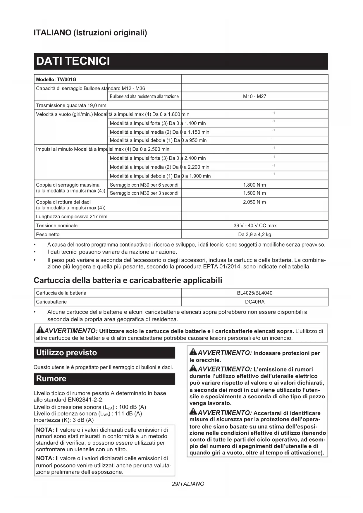 - Alcune cartucce delle batterie e alcuni caricabatterie elencati sopra potrebbero non essere disponibili a seconda della propria area geograca di residenza. AVVERTIMENTO: Utilizzare solo le cartucce delle batterie e i caricabatterie elencati sopra. L’utilizzo di altre cartucce delle batterie e di altri caricabatterie potrebbe causare lesioni personali e/o un incendio. Utilizzo previsto Questo utensile è progettato per il serraggio di bulloni e dadi. Rumore Livello tipico di rumore pesato A determinato in base allo standard EN62841-2-2: Livello di pressione sonora (L