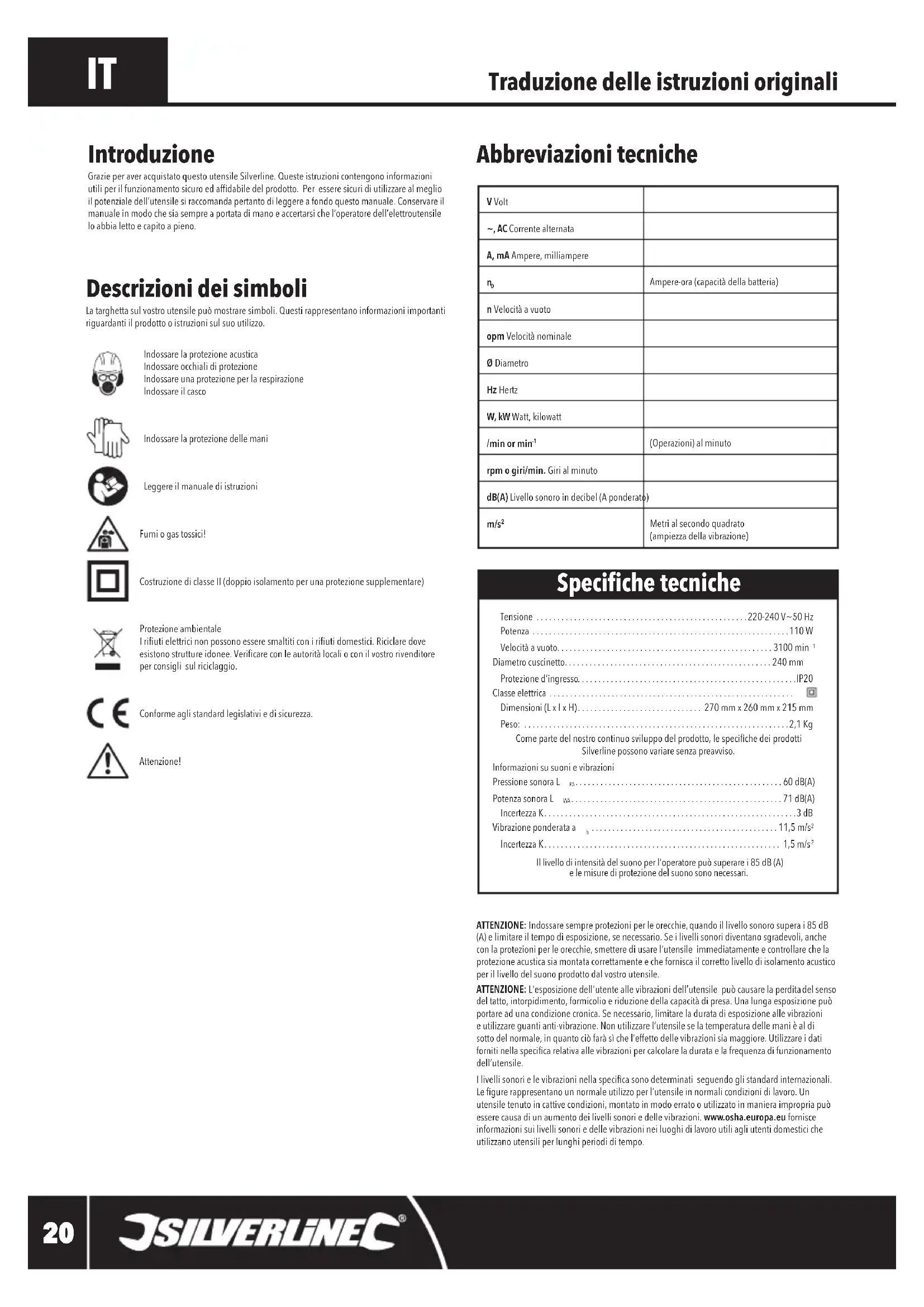 Il livello di intensità del suono per l'operatore può superare i 85 dB (A) e le misure di protezione del suono sono necessari. Introduzione Grazie per aver acquistato questo utensile Silverline. Queste istruzioni contengono informazioni utili per il funzionamento sicuro ed afdabile del prodotto. Per essere sicuri di utilizzare al meglio il potenziale dell’utensile si raccomanda pertanto di leggere a fondo questo manuale. Conservare il manuale in modo che sia sempre a portata di mano e accertarsi che l’operatore dell’elettroutensile lo abbia letto e capito a pieno. Speciche tecniche V Volt~, AC Corrente alternataA, mA Ampere, milliampere