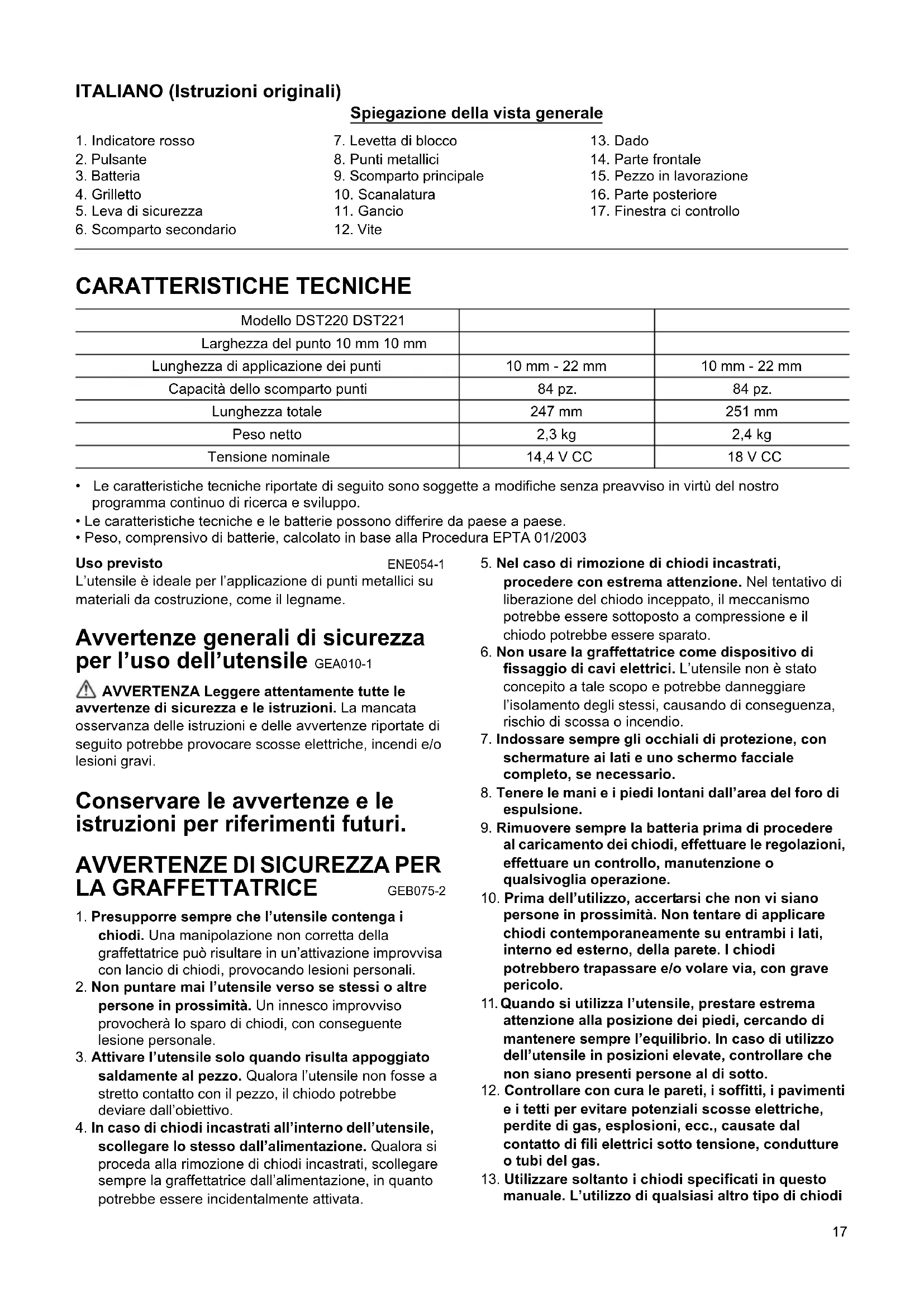 - Peso, comprensivo di batterie, calcolato in base alla Procedura EPTA 01/2003 Uso previsto ENE054-1 L’utensile è ideale per l’applicazione di punti metallici su materiali da costruzione, come il legname. Avvertenze generali di sicurezza per l’uso dell’utensile GEA010-1 AVVERTENZA Leggere attentamente tutte le avvertenze di sicurezza e le istruzioni. La mancata osservanza delle istruzioni e delle avvertenze riportate di seguito potrebbe provocare scosse elettriche, incendi e/o lesioni gravi. Conservare le avvertenze e le istruzioni per riferimenti futuri.
