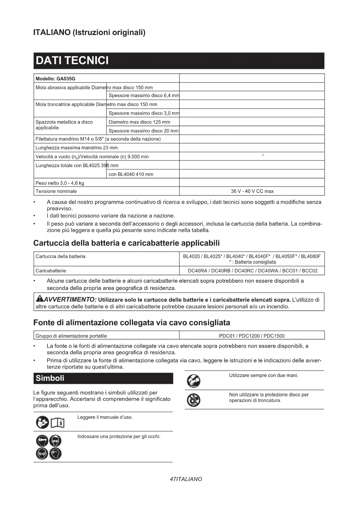 GA035G 4,0 1,5 NOTA: Il valore o i valori complessivi delle vibrazioni dichiarati sono stati misurati in conformità a un metodo stan- dard di verica, e possono essere utilizzati per confrontare un utensile con un altro. NOTA: Il valore o i valori complessivi delle vibrazioni dichiarati possono venire utilizzati anche per una valutazione preliminare dell’esposizione. AVVERTIMENTO: L’emissione delle vibrazioni durante l’utilizzo eettivo dell’utensile elettrico può variare rispetto al valore o ai valori dichiarati, a seconda dei modi in cui viene utilizzato l’utensile, special- mente a seconda di che tipo di pezzo venga lavorato. AVVERTIMENTO: Accertarsi di identicare misure di sicurezza per la protezione dell’operatore che siano basate su una stima dell’esposizione nelle condizioni eettive di utilizzo (tenendo conto di tutte le parti del ciclo operativo, ad esempio del numero di spegnimenti dell’utensile e di quando giri a vuoto, oltre al tempo di attivazione). AVVERTIMENTO: Il valore di emissione delle vibrazioni dichiarato viene utilizzato per le applicazioni prin- cipali dell’utensile elettrico. Tuttavia, qualora l’utensile elettrico venga utilizzato per altre applicazioni, il valore di emissione delle vibrazioni potrebbe essere diverso. Dichiarazioni di conformità Solo per i paesi europei Le Dichiarazioni di conformità sono incluse nell’Allegato A al presente manuale d’uso. AVVERTENZE DI SICUREZZA Avvertenze generali relative alla sicurezza dell’utensile elettrico AVVERTIMENTO Leggere tutte le avvertenze di sicurezza, le istruzioni, le illustrazioni e i dati tecnici forniti insieme a questo utensile elettrico. La man- cata osservanza di tutte le istruzioni seguenti potrebbe risultare in scosse elettriche, incendi e/o gravi lesioni personali. Conservare tutte le avvertenze e le istruzioni come riferimento futuro. Il termine “utensile elettrico” nelle avvertenze si riferisce sia all’utensile elettrico (cablato) nel funzionamento alimentato da rete elettrica che all’utensile elettrico (a batteria) nel funzionamento alimentato a batteria. Avvertenze di sicurezza relative alla smerigliatrice a batteria Avvertenze di sicurezza comuni relative alle opera- zioni di smerigliatura, carteggiatura, spazzolatura metallica o troncatura: