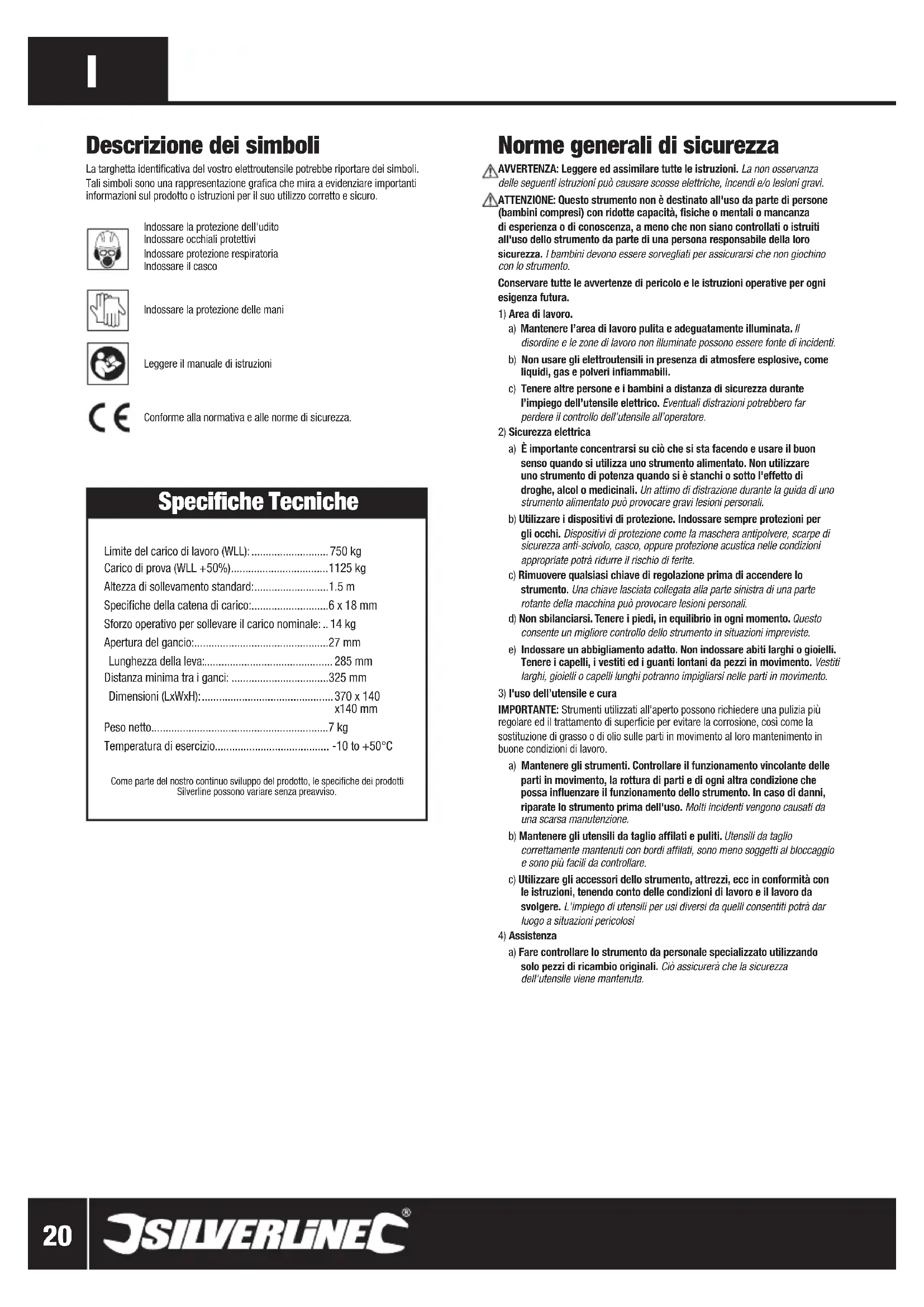 Norme generali di sicurezza AVVERTENZA: Leggere ed assimilare tutte le istruzioni. La non osservanza delle seguenti istruzioni può causare scosse elettriche, incendi e/o lesioni gravi.ATTENZIONE: Questo strumento non è destinato all'uso da parte di persone (bambini compresi) con ridotte capacità, fisiche o mentali o mancanza di esperienza o di conoscenza, a meno che non siano controllati o istruiti all'uso dello strumento da parte di una persona responsabile della loro sicurezza. I bambini devono essere sorvegliati per assicurarsi che non giochino con lo strumento.Conservare tutte le avvertenze di pericolo e le istruzioni operative per ogni esigenza futura.1) Area di lavoro. a) Mantenere l’area di lavoro pulita e adeguatamente illuminata. Il disordine e le zone di lavoro non illuminate possono essere fonte di incidenti.b) Non usare gli elettroutensili in presenza di atmosfere esplosive, come liquidi, gas e polveri infiammabili. c) Tenere altre persone e i bambini a distanza di sicurezza durante l’impiego dell’utensile elettrico. Eventuali distrazioni potrebbero far perdere il controllo dell’utensile all’operatore.2) Sicurezza elettricaa) È importante concentrarsi su ciò che si sta facendo e usare il buon senso quando si utilizza uno strumento alimentato. Non utilizzare uno strumento di potenza quando si è stanchi o sotto l'effetto di droghe, alcol o medicinali. Un attimo di distrazione durante la guida di uno strumento alimentato può provocare gravi lesioni personali.b) Utilizzare i dispositivi di protezione. Indossare sempre protezioni per gli occhi. Dispositivi di protezione come la maschera antipolvere, scarpe di sicurezza anti-scivolo, casco, oppure protezione acustica nelle condizioni appropriate potrà ridurre il rischio di ferite.c) Rimuovere qualsiasi chiave di regolazione prima di accendere lo strumento. Una chiave lasciata collegata alla parte sinistra di una parte rotante della macchina può provocare lesioni personali. d) Non sbilanciarsi. Tenere i piedi, in equilibrio in ogni momento. Questo consente un migliore controllo dello strumento in situazioni impreviste.e) Indossare un abbigliamento adatto. Non indossare abiti larghi o gioielli. Tenere i capelli, i vestiti ed i guanti lontani da pezzi in movimento. Vestiti larghi, gioielli o capelli lunghi potranno impigliarsi nelle parti in movimento.3) l'uso dell’utensile e curaIMPORTANTE: Strumenti utilizzati all'aperto possono richiedere una pulizia più regolare ed il trattamento di superficie per evitare la corrosione, così come la sostituzione di grasso o di olio sulle parti in movimento al loro mantenimento in buone condizioni di lavoro.a) Mantenere gli strumenti. Controllare il funzionamento vincolante delle parti in movimento, la rottura di parti e di ogni altra condizione che possa influenzare il funzionamento dello strumento. In caso di danni, riparate lo strumento prima dell'uso. Molti incidenti vengono causati da una scarsa manutenzione. b) Mantenere gli utensili da taglio affilati e puliti. Utensili da taglio correttamente mantenuti con bordi affilati, sono meno soggetti al bloccaggio e sono più facili da controllare.c) Utilizzare gli accessori dello strumento, attrezzi, ecc in conformità con le istruzioni, tenendo conto delle condizioni di lavoro e il lavoro da svolgere. L'impiego di utensili per usi diversi da quelli consentiti potrà dar luogo a situazioni pericolosi4) Assistenzaa) Fare controllare lo strumento da personale specializzato utilizzando solo pezzi di ricambio originali. Ciò assicurerà che la sicurezza dell'utensile viene mantenuta. Descrizione dei simboli La targhetta identificativa del vostro elettroutensile potrebbe riportare dei simboli. Tali simboli sono una rappresentazione grafica che mira a evidenziare importanti informazioni sul prodotto o istruzioni per il suo utilizzo corretto e sicuro. Indossare la protezione dell'uditoIndossare occhiali protettiviIndossare protezione respiratoriaIndossare il casco Indossare la protezione delle mani Leggere il manuale di istruzioniConforme alla normativa e alle norme di sicurezza. Specifiche Tecniche Limite del carico di lavoro (WLL): ........................... 750 kg Carico di prova (WLL +50%) .................................. 1125 kg Altezza di sollevamento standard: ..........................1.5 m Specifiche della catena di carico:...........................6 x 18 mm Sforzo operativo per sollevare il carico nominale: .. 14 kg Apertura del gancio: ...............................................27 mm Lunghezza della leva:............................................. 285 mm Distanza minima tra i ganci: ..................................325 mm Dimensioni (LxWxH): .............................................. 370 x 140 x140 mm Peso netto..............................................................7 kg Temperatura di esercizio........................................ -10 to +50°C Come parte del nostro continuo sviluppo del prodotto, le specifiche dei prodotti Silverline possono variare senza preavviso. 633809_Z1MANPRO1.indd 20 20/12/2013 11:09www.silverlinetools.com