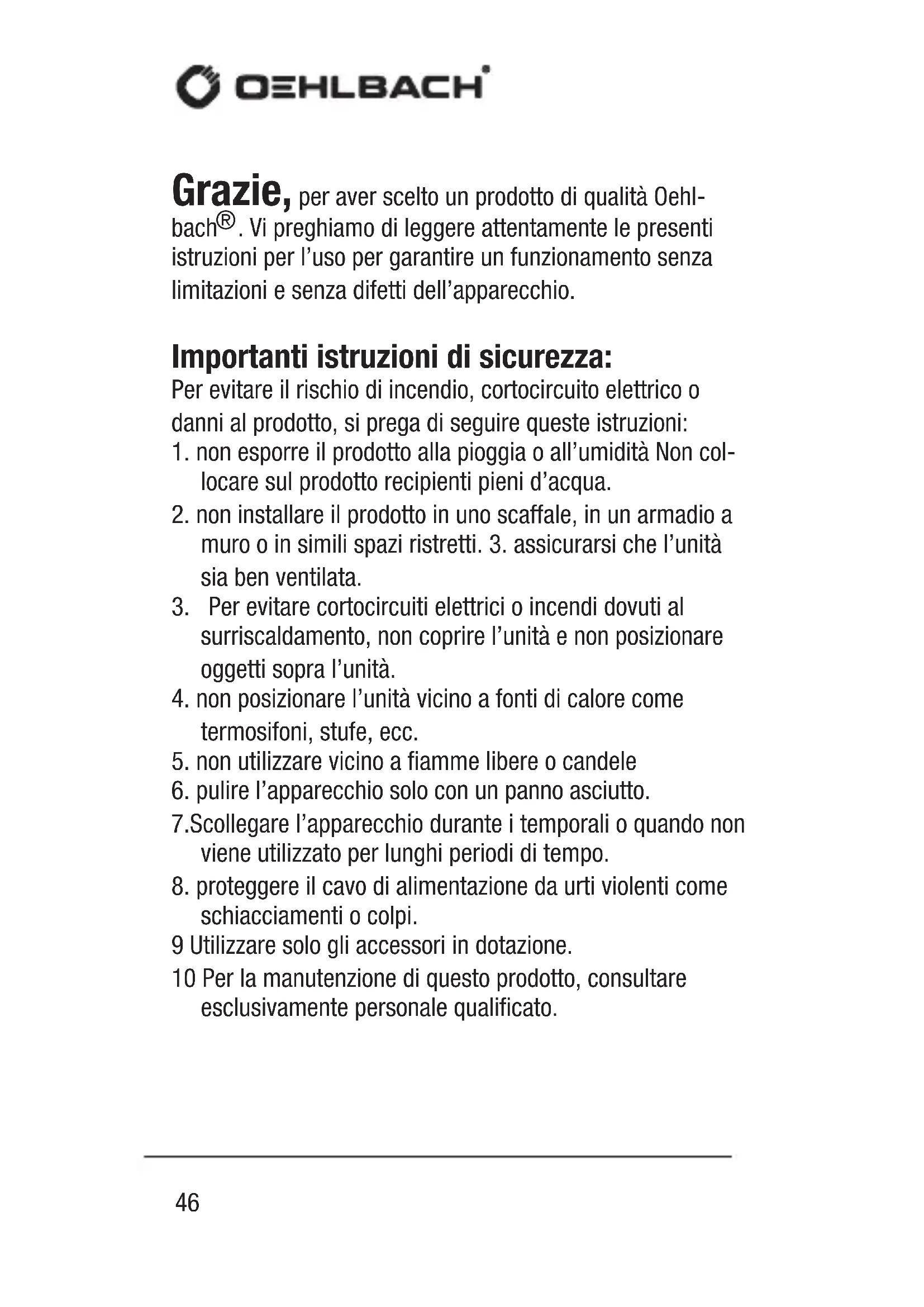 . Vi preghiamo di leggere attentamente le presenti istruzioni per l’uso per garantire un funzionamento senza limitazioni e senza difetti dell’apparecchio. Importanti istruzioni di sicurezza: Per evitare il rischio di incendio, cortocircuito elettrico o danni al prodotto, si prega di seguire queste istruzioni: