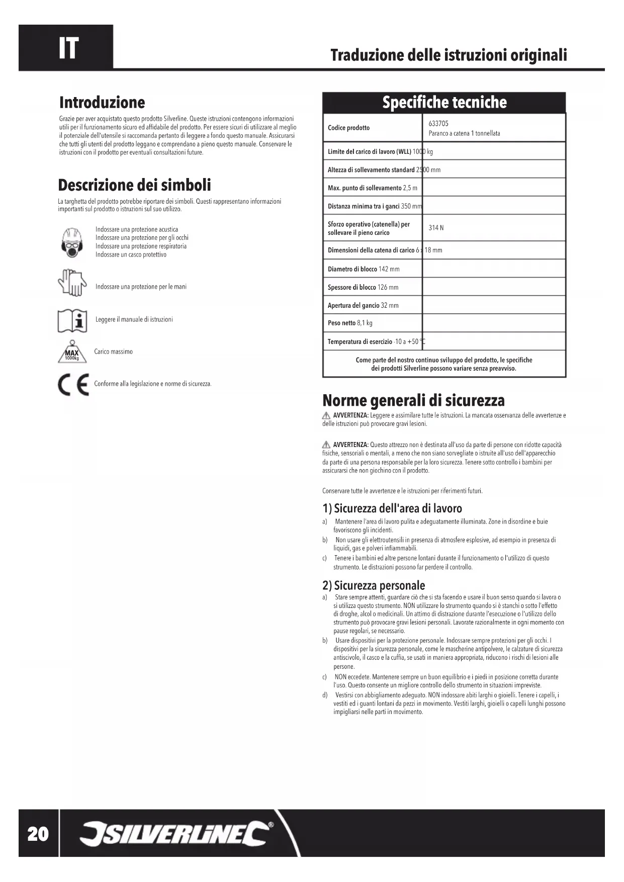 Scarica le istruzioni per il tuo Paranco in formato PDF gratuitamente! Trova il tuo manuale 633705 - SILVERLINE e riprendi in mano il tuo dispositivo elettronico. In questa pagina sono pubblicati tutti i documenti necessari per l'utilizzo del tuo dispositivo. 633705 del marchio SILVERLINE.
