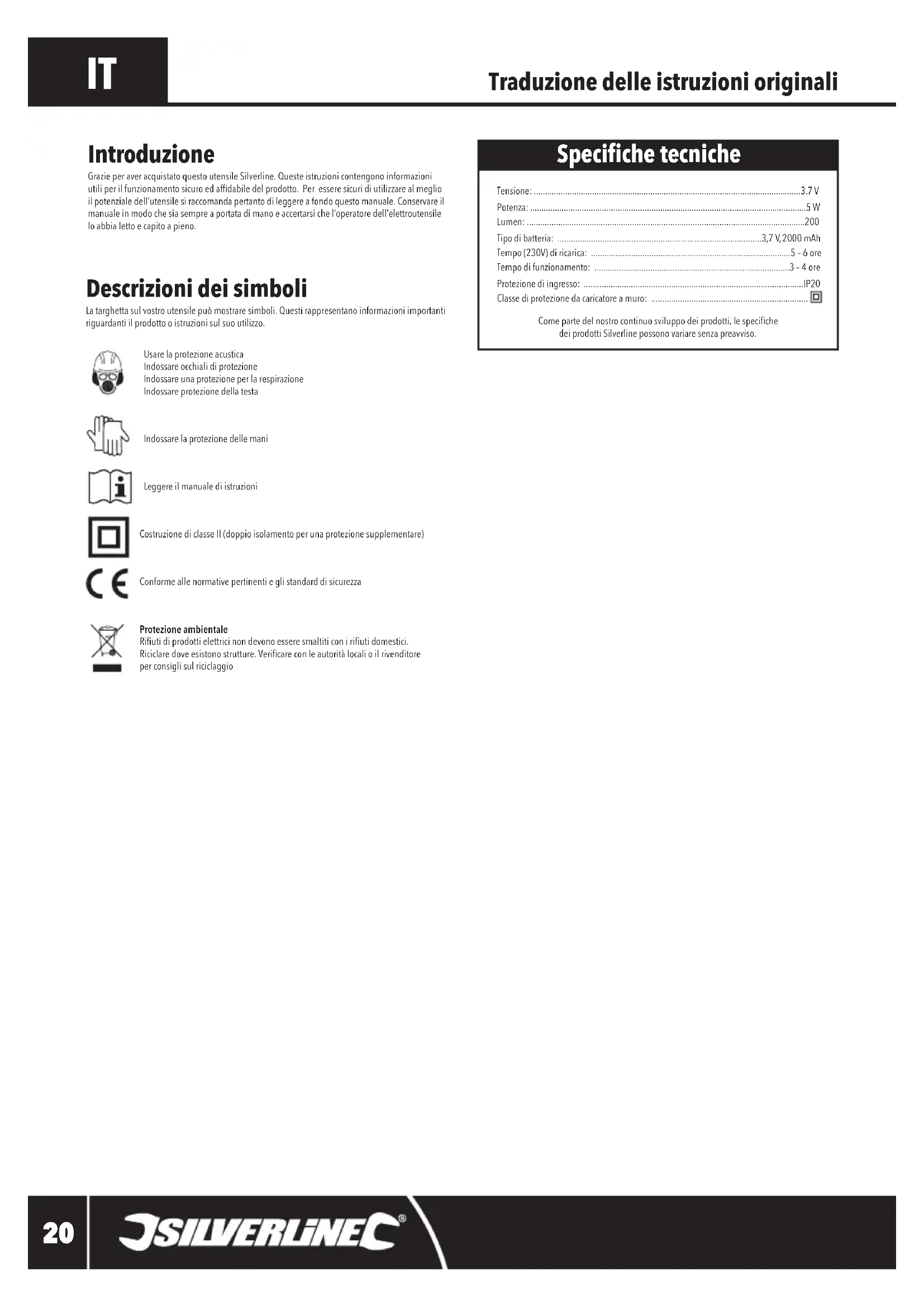 silverlinetools.com Norme generali di sicurezza AVVERTENZA: Leggere ed assimilare tutte le istruzioni. La non osservanza delle seguenti istruzioni può causare scosse elettriche, incendi e/o lesioni gravi. ATTENZIONE: Questo apparecchio non è destinato all'uso da parte di persone (inclusi i bambini) con capacità ridotta, siche o mentali o con mancanza di esperienza o di conoscenza, a meno che non siano controllati o istruiti all'uso dell'apparecchio da una persona responsabile della loro sicurezza. I bambini devono essere sorvegliati per assicurarsi che non giochino con l'apparecchio.Conservare tutte le avvertenze di pericolo e le istruzioni operative per ogni esigenza futura.Il termine “elettroutensile” si riferisce all’utensile a rete ssa (con lo) o un utensile a batteria (senza lo).Area di lavoro a) Mantenere l’area di lavoro pulita e adeguatamente illuminata. Il disordine e le zone di lavoro non illuminate possono essere fonte di incidenti. Gli elettroutensili producono scintille che potrebbero accendere le polveri o i fumi.Sicurezza elettrica a) Le spine degli elettroutensili devono essere compatibili con le prese di corrente. Non modicare in alcun modo la spina dell’elettroutensile. Non usare adattatori con gli elettroutensili dotati di collegamento di messa a terra. L’uso delle spine originali non modicate e delle prese corrispondenti ridurrà il rischio di scosse elettriche. b) Evitare il contatto del corpo con le superci collegate a massa come i tubi, i radiatori, le cucine e i frigoriferi. Se il corpo dell’operatore è collegato alla terra o alla massa il rischio di scosse elettriche è maggiore.c) Non esporre gli elettroutensili alla pioggia e non lasciarli in ambienti umidi o bagnati. L’ingresso dell’acqua in una macchina utensile aumenta il rischio di scosse elettriche. d) Non usare il cavo in modo improprio. Non afferrare mai il cavo per trasportare, tirare o staccare l’elettroutensile dalla presa di corrente. Tenere il cavo lontano da fonti di calore, olio, e sostanze afni, bordi appuntiti o parti in movimento. I cavi danneggiati o attorcigliati aumentano il rischio di scosse elettriche. e) Se l’utilizzo di un elettroutensile in ambiente umido è inevitabile, utilizzare una fonte di alimentazione protetta da un dispositivo differenziale. L’uso di un dispositivo differenziale riduce notevolmente il rischio di scosse elettriche.Sicurezza personalea) Quando si usa un elettroutensile lavorare sempre con la massima attenzione e concentrazione, lasciandosi guidare dal buon senso. Non usare mai un elettroutensile quando si è stanchi o sotto l’effetto di medicinali e/o sostanze alcoliche o stupefacenti. Quando si usa un elettroutensile un attimo di distrazione è sufciente a causare gravi lesioni alle persone. b) Usare dispositivi per la protezione personale. Indossare sempre protezioni per gli occhi. I dispositivi per la sicurezza personale, se usati in maniera appropriata, riducono i rischi di lesioni alle persone. c) Evitare l’avviamento accidentale. Garantire che l’interruttore è in posizione arresto (OFF) prima di attaccare la presa. Trasportare gli elettroutensili con il dito al di sopra dell’interruttore o attaccando l’elettroutensile con l’interruttore acceso, aumenta il rischio di accidenti. d) Non andare oltre l’altezza consentita. In qualsiasi momento mantenere i piedi poggiati su superci solide e un punto di appoggio sicuro. Un buon equilibrio consente di avere il massimo controllo sull’elettroutensile nelle situazioni inaspettate.Maneggio ed impiego accurato di utensili elettrici a) Non forzare l’elettroutensile. Usare sempre l’elettroutensile corretto per il lavoro da eseguire. L’elettroutensile corretto sarà in grado di svolgere il lavoro in modo più efciente e sicuro nell’ambito della gamma di potenza indicata. b) Non usare l’elettroutensile se l’interruttore di accensione non si accende e si spegne. Gli elettroutensili con un interruttore di accensione difettoso sono pericolosi e devono essere riparati immediatamente.c) Staccare la spina dalla presa di corrente prima di effettuare qualsiasi regolazione, sostituire gli accessori o riporre gli attrezzi a motore. Queste misure di sicurezza preventive riducono il rischio di avvio involontario. d) Conservare l’elettroutensile fuori dalla portata dei bambini e non lasciare che venga utilizzato da persone non adeguatamente addestrate e competenti nell’uso degli elettroutensili o che non abbiano letto questo manuale di istruzioni. Gli elettroutensili diventano estremamente pericolosi nelle mani di persone non addestrate. e) Mantenere gli elettroutensili. Controllare per disallineamento o la legatura delle parti in movimento, la rottura di parti e altre condizioni che possono inuire il funzionamento dell’apparecchio. In caso di danneggiamento, fare riparare prima dell’uso. Molti incidenti sono causati da una scarsa manutenzione dell’utensile.f) Utilizzare l’elettroutensile e tutti i componenti e gli accessori in conformità con le istruzioni di questo manuale e nella maniera prevista per ciascun tipo di utensile, tenendo conto delle condizioni lavorative e del compito da eseguire. L’utilizzo degli elettroutensili per ni diversi da quelli previsti rappresenta un rischio per le persone.Assistenzaa) Qualsiasi intervento sull’elettroutensile deve essere eseguito da personale qualicato utilizzando unicamente pezzi di ricambio compatibili e approvati. Ciò garantisce la sicurezza dell’utensile elettrico. Sicurezza del carica batterie Utilizzare il caricabatterie correttamente