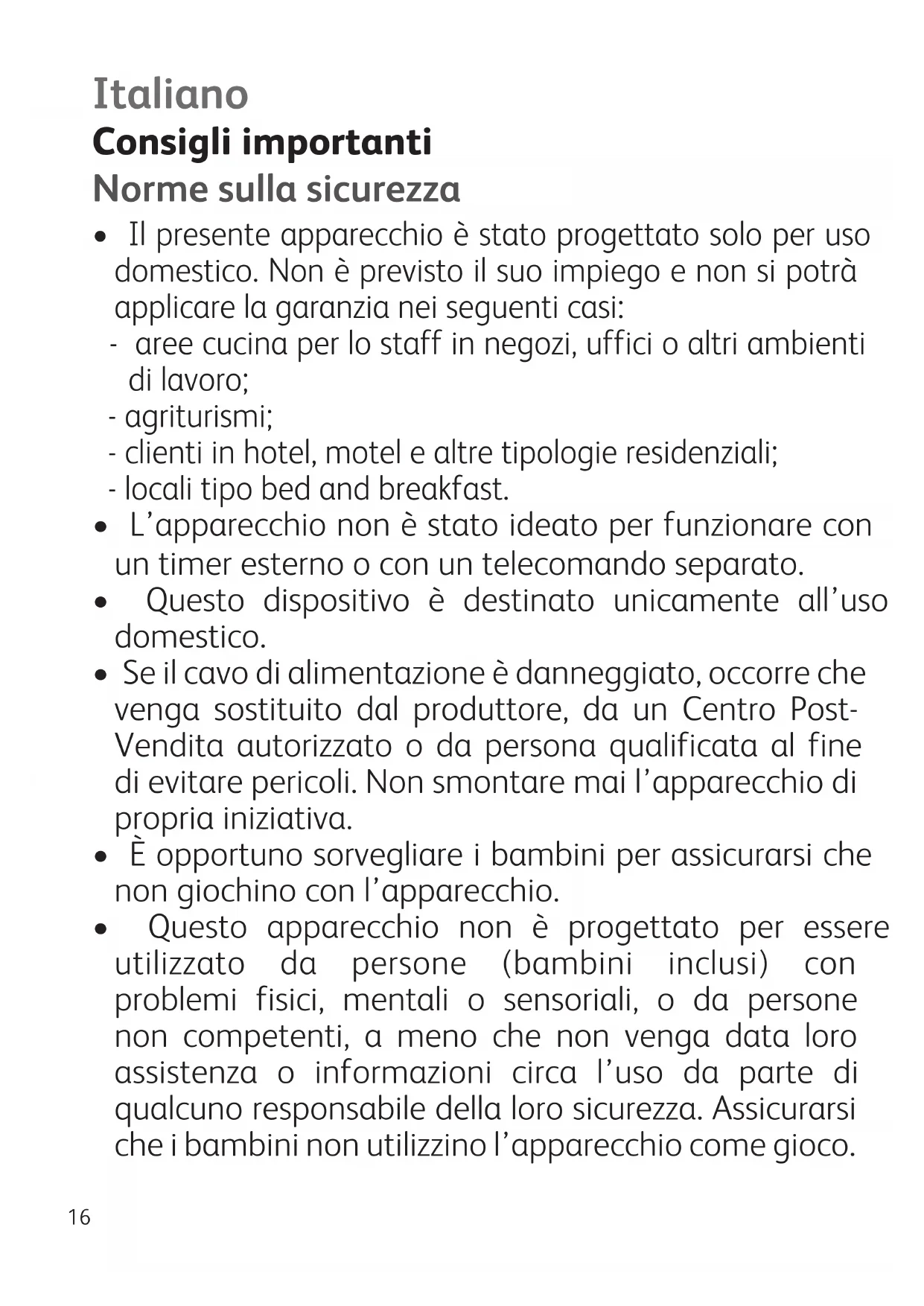 - Il presente apparecchio è stato progettato solo per uso domestico. Non è previsto il suo impiego e non si potrà applicare la garanzia nei seguenti casi: - aree cucina per lo staff in negozi, uffici o altri ambienti di lavoro; - agriturismi; - clienti in hotel, motel e altre tipologie residenziali; - locali tipo bed and breakfast.