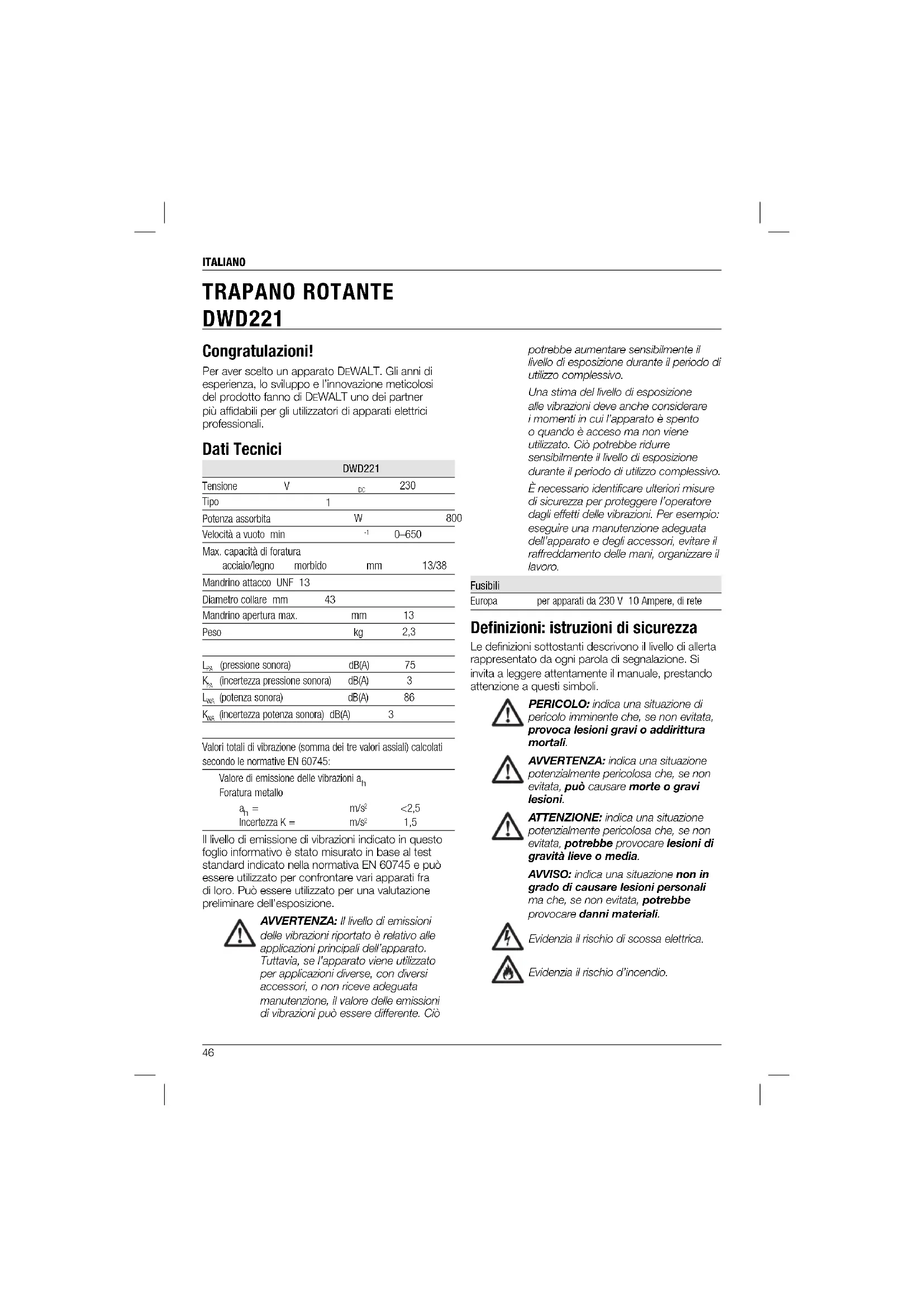 TRAPANO ROTANTE DWD221 Congratulazioni! Per aver scelto un apparato DEWALT. Gli anni di esperienza, lo sviluppo e l’innovazione meticolosi del prodotto fanno di DEWALT uno dei partner più affidabili per gli utilizzatori di apparati elettrici professionali. Dati Tecnici DWD221 Tensione V