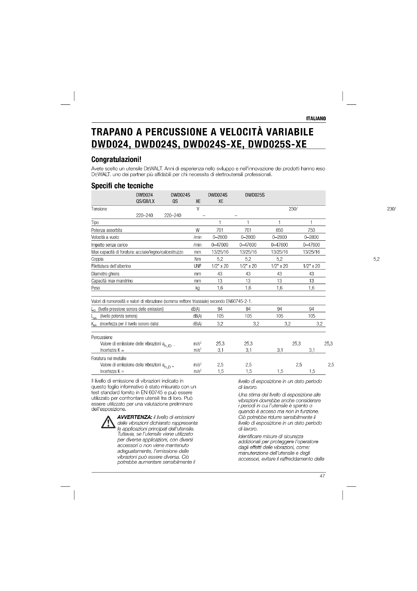 EWALT. uno dei partner più affidabili per chi necessita di elettroutensili professionali. Specifi che tecniche DWD024 DWD024S DWD024S DWD025S QS/GB/LX QS XE XE Tensione V 230/ 230/ 230 230 220–240 220–240 – – Tipo 1 1 1 1 Potenza assorbita W 701 701 650 750 Velocità a vuoto /min 0–2800 0–2800 0–2800 0–2800 Impatto senza carico /min 0–47600 0–47600 0–47600 0–47600 Max capacità di foratura: acciaio/legno/calcestruzzo mm 13/25/16 13/25/16 13/25/16 13/25/16 Coppia Nm 5,2 5,2 5,2 5,2 Filettatura dell’alberino UNF 1/2" x 20 1/2" x 20 1/2" x 20 1/2" x 20 Diametro ghiera mm 43 43 43 43 Capacità max mandrino mm 13 13 13 13 Peso kg 1,6 1,6 1,6 1,6 Valori di rumorosità e valori di vibrazione (somma vettore triassiale) secondo EN60745-2-1.