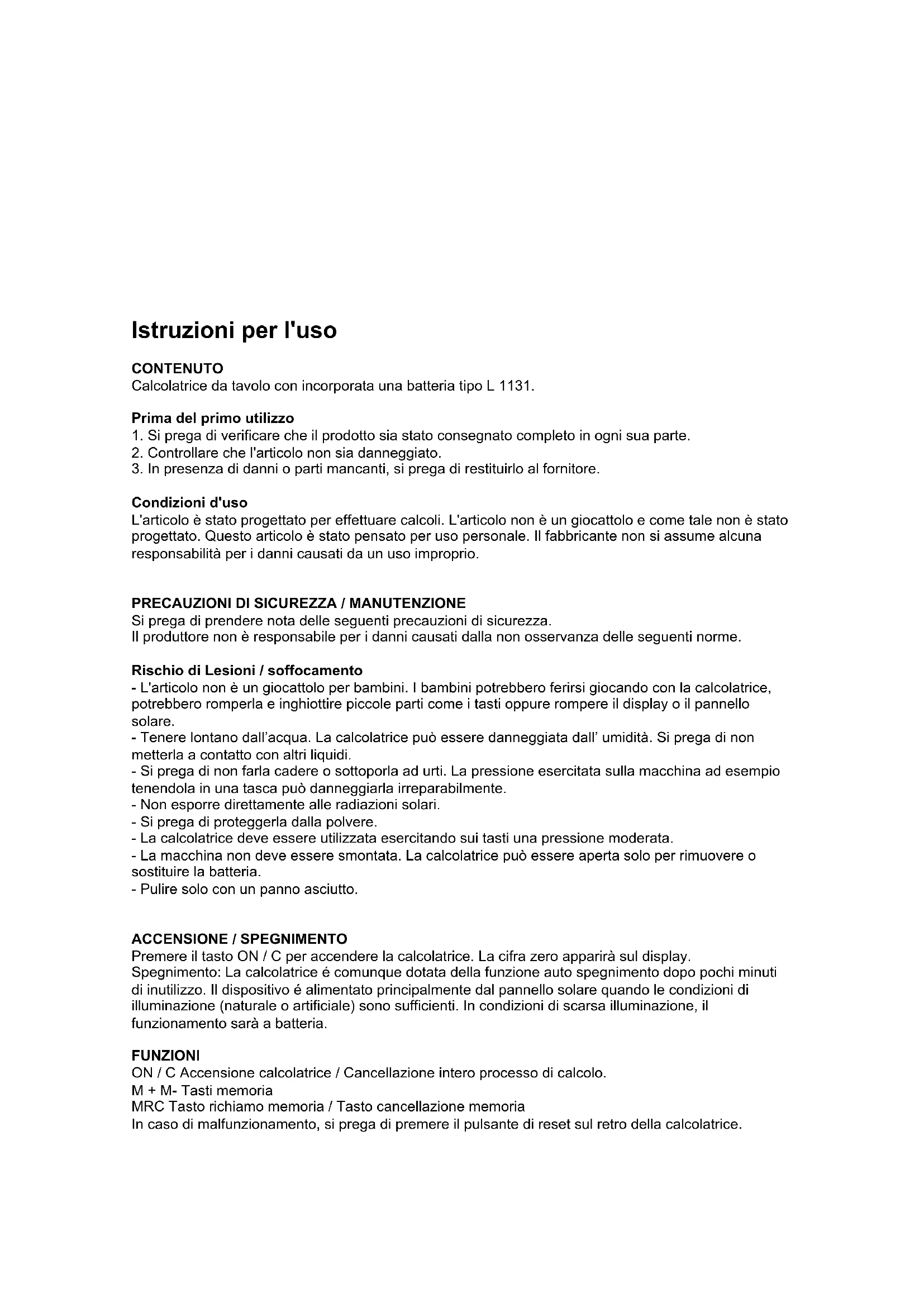 Si prega di prendere nota delle seguenti precauzioni di sicurezza. Il produttore non è responsabile per i danni causati dalla non osservanza delle seguenti norme. Rischio di Lesioni / soffocamento - L'articolo non è un giocattolo per bambini. I bambini potrebbero ferirsi giocando con la calcolatrice, potrebbero romperla e inghiottire piccole parti come i tasti oppure rompere il display o il pannello solare. - Tenere lontano dall’acqua. La calcolatrice può essere danneggiata dall’ umidità. Si prega di non metterla a contatto con altri liquidi. - Si prega di non farla cadere o sottoporla ad urti. La pressione esercitata sulla macchina ad esempio tenendola in una tasca può danneggiarla irreparabilmente. - Non esporre direttamente alle radiazioni solari. - Si prega di proteggerla dalla polvere. - La calcolatrice deve essere utilizzata esercitando sui tasti una pressione moderata. - La macchina non deve essere smontata. La calcolatrice può essere aperta solo per rimuovere o sostituire la batteria. - Pulire solo con un panno asciutto.