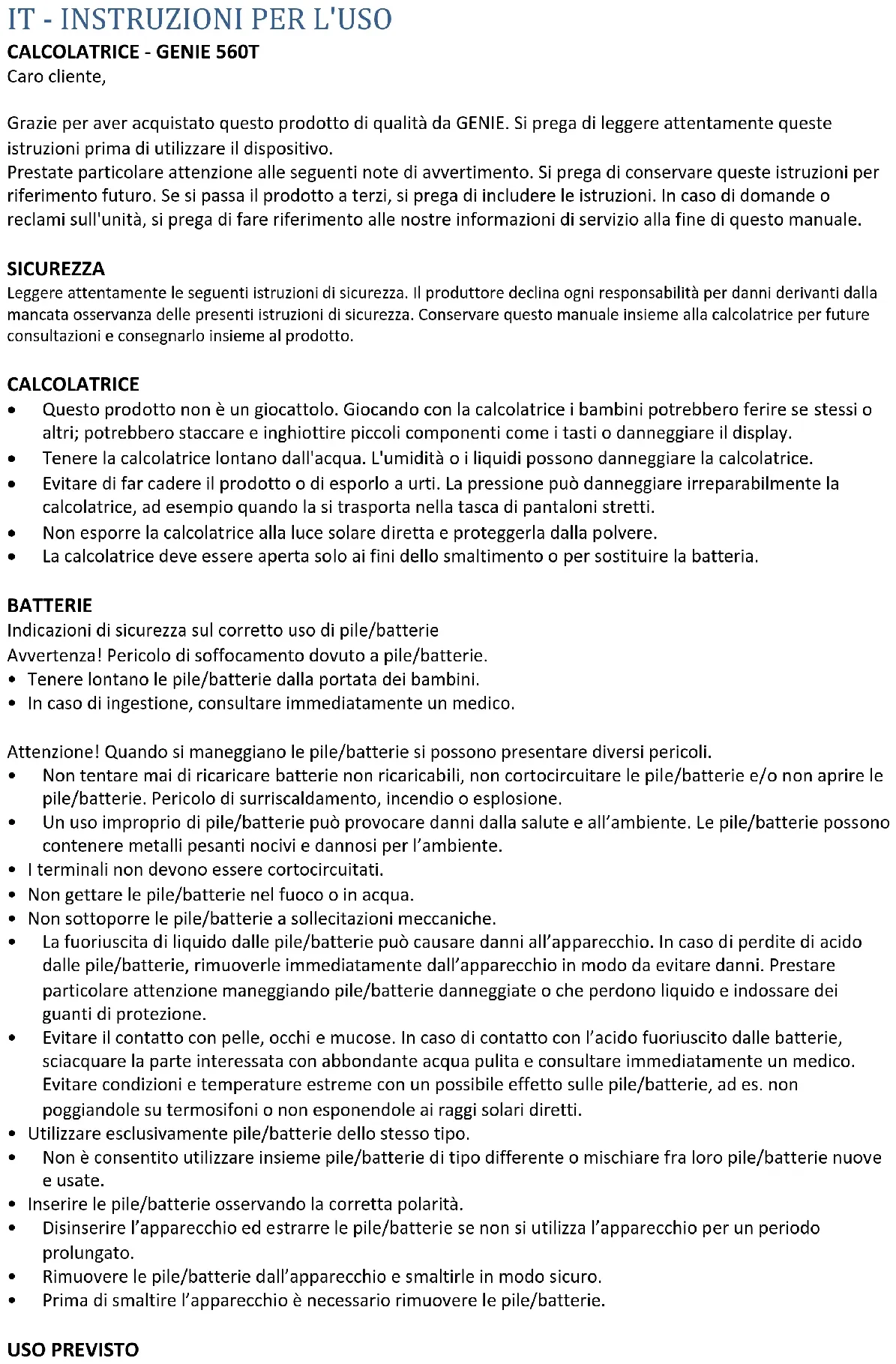 Caro cliente, Grazie per aver acquistato questo prodotto di qualità da GENIE. Si prega di leggere attentamente queste istruzioni prima di utilizzare il dispositivo. Prestate particolare attenzione alle seguenti note di avvertimento. Si prega di conservare queste istruzioni per riferimento futuro. Se si passa il prodotto a terzi, si prega di includere le istruzioni. In caso di domande o reclami sull'unità, si prega di fare riferimento alle nostre informazioni di servizio alla fine di questo manuale. SICUREZZA Leggere attentamente le seguenti istruzioni di sicurezza. Il produttore declina ogni responsabilità per danni derivanti dalla mancata osservanza delle presenti istruzioni di sicurezza. Conservare questo manuale insieme alla calcolatrice per future consultazioni e consegnarlo insieme al prodotto. CALCOLATRICE