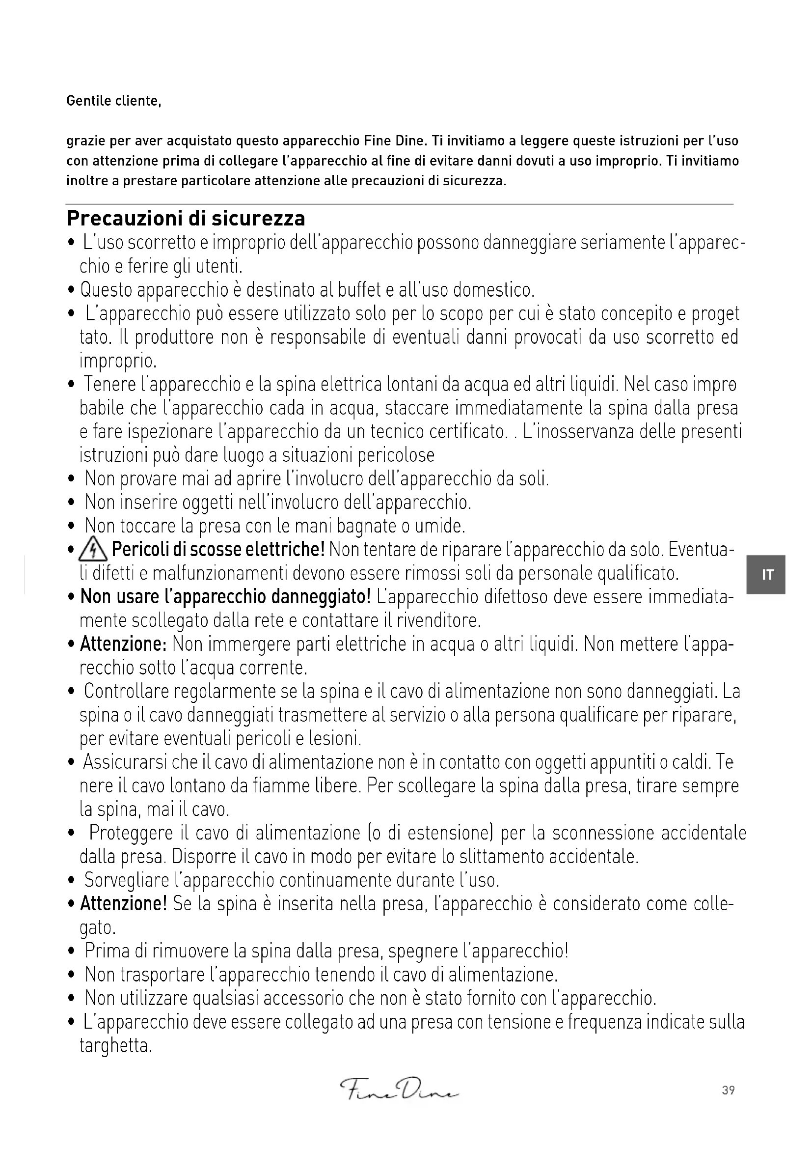 Gentile cliente, grazie per aver acquistato questo apparecchio Fine Dine. Ti invitiamo a leggere queste istruzioni per l’uso con attenzione prima di collegare l’apparecchio al fine di evitare danni dovuti a uso improprio. Ti invitiamo inoltre a prestare particolare attenzione alle precauzioni di sicurezza. Precauzioni di sicurezza