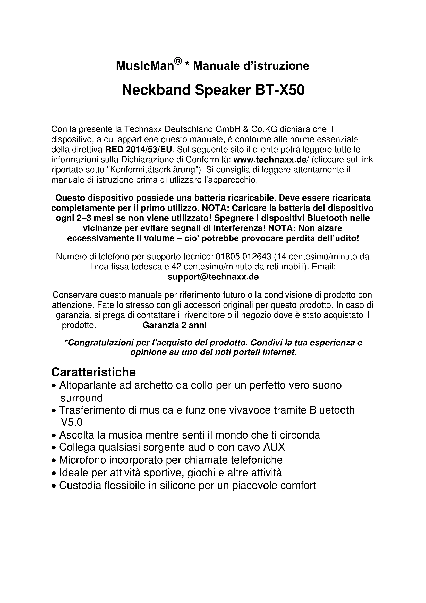 - Manuale d’istruzione Neckband Speaker BT-X50 Con la presente la Technaxx Deutschland GmbH & Co.KG dichiara che il dispositivo, a cui appartiene questo manuale, é conforme alle norme essenziale della direttiva RED 2014/53/EU. Sul seguente sito il cliente potrá leggere tutte le informazioni sulla Dichiarazione di Conformità: www.technaxx.de/ (cliccare sul link riportato sotto "Konformitätserklärung"). Si consiglia di leggere attentamente il manuale di istruzione prima di utlizzare l’apparecchio. Questo dispositivo possiede una batteria ricaricabile. Deve essere ricaricata completamente per il primo utilizzo. NOTA: Caricare la batteria del dispositivo ogni 2–3 mesi se non viene utilizzato! Spegnere i dispositivi Bluetooth nelle vicinanze per evitare segnali di interferenza! NOTA: Non alzare eccessivamente il volume – cio' potrebbe provocare perdita dell’udito! Numero di telefono per supporto tecnico: 01805 012643 (14 centesimo/minuto da linea fissa tedesca e 42 centesimo/minuto da reti mobili). Email: support@technaxx.de Conservare questo manuale per riferimento futuro o la condivisione di prodotto con attenzione. Fate lo stresso con gli accessori originali per questo prodotto. In caso di garanzia, si prega di contattare il rivenditore o il negozio dove è stato acquistato il prodotto. Garanzia 2 anni *Congratulazioni per l'acquisto del prodotto. Condivi la tua esperienza e opinione su uno dei noti portali internet. Caratteristiche