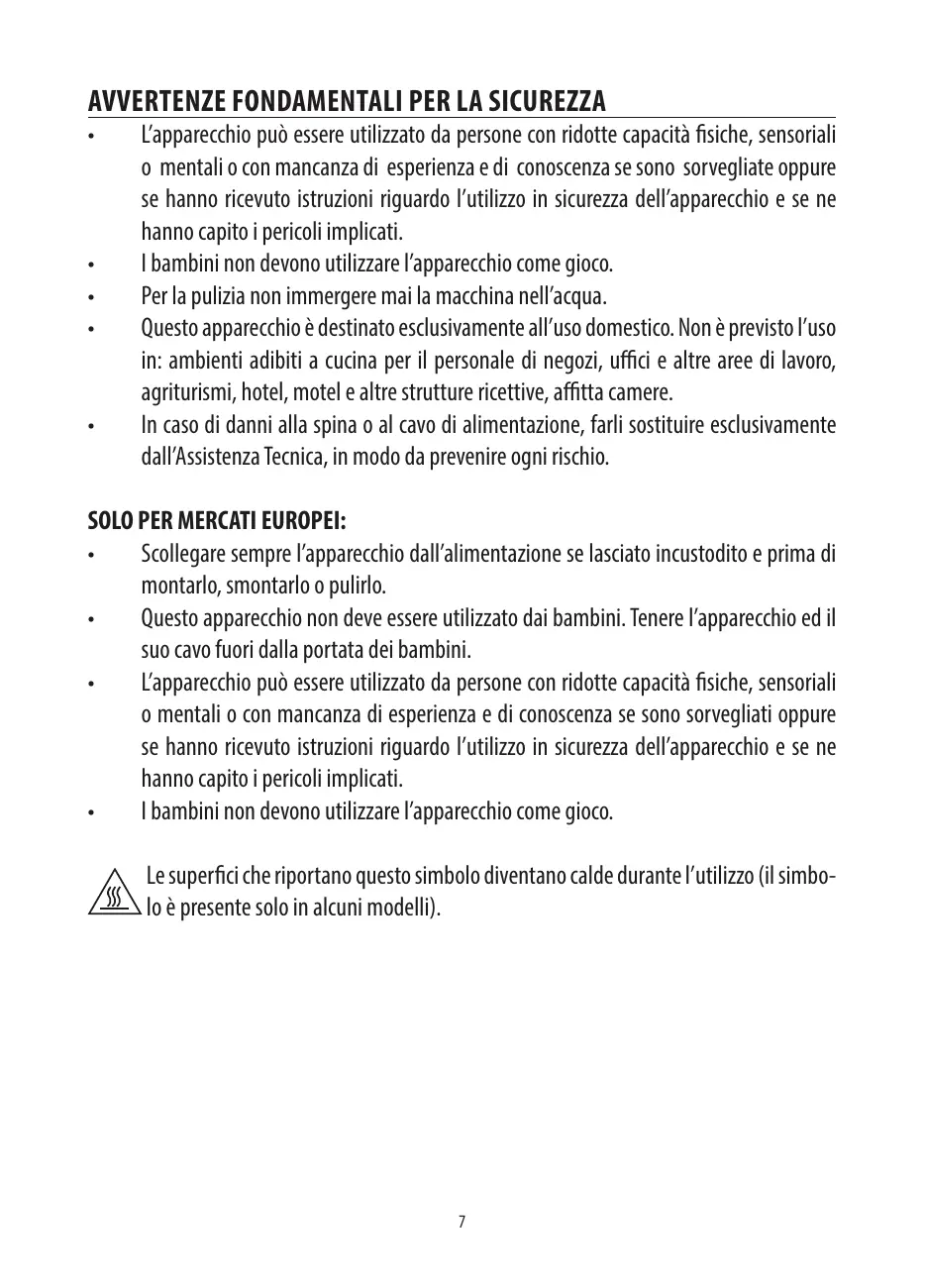22 Pour le nettoyage, ne jamais plonger la machine dans l'eau. Cet appareil est destiné exclusivement à un usage domestique. N'est pas prévue l'utilisation dans : des locaux faisant office de cuisine pour le personnel de magasins, bureaux et autres zones de travail, les gîtes ruraux, les hôtels, les motels et autres structures d'hébergement, les pensions. En cas de dommages au niveau de la fiche ou du cordon d'alimentation, les faire remplacer exclusivement par l'Assistance Technique afin de prévenir tous les risques.