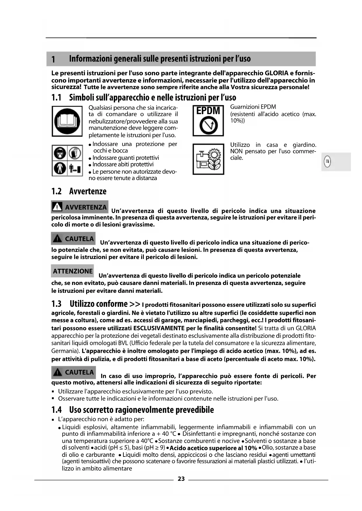 agricole, forestali o giardini. Ne è vietato l'utilizzo su altre superfici (le cosiddette superfici non messe a coltura), come ad es. accessi di garage, marciapiedi, parcheggi, ecc.! I prodotti fitosani- tari possono essere utilizzati ESCLUSIVAMENTE per le finalità consentite! Si tratta di un GLORIA apparecchio per la protezione dei vegetali destinato esclusivamente alla distribuzione di prodotti fito- sanitari liquidi omologati BVL (Ufficio federale per la tutela del consumatore e la sicurezza alimentare, Germania). L'apparecchio è inoltre omologato per l'impiego di acido acetico (max. 10%), ad es. per attività di pulizia, e di prodotti fitosanitari a base di aceto (percentuale di aceto max. 10%). In caso di uso improprio, l’apparecchio può essere fonte di pericoli. Per questo motivo, attenersi alle indicazioni di sicurezza di seguito riportate: