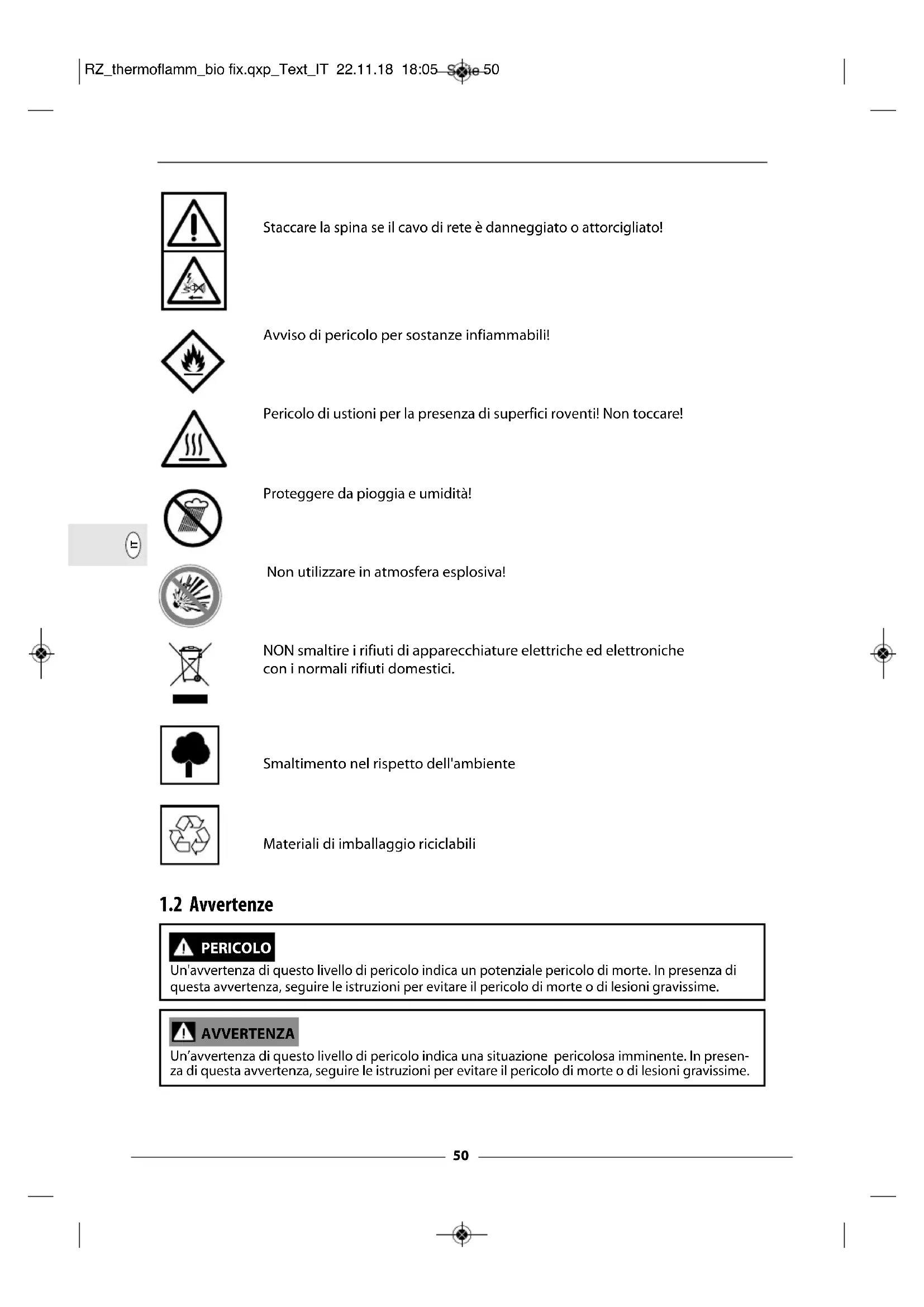 PERICOLO Un'avvertenza di questo livello di pericolo indica un potenziale pericolo di morte. In presenza di questa avvertenza, seguire le istruzioni per evitare il pericolo di morte o di lesioni gravissime. AVVERTENZA Un’avvertenza di questo livello di pericolo indica una situazione pericolosa imminente. In presen- za di questa avvertenza, seguire le istruzioni per evitare il pericolo di morte o di lesioni gravissime. RZ_thermoflamm_bio fix.qxp_Text_IT 22.11.18 18:05 Seite 5051
