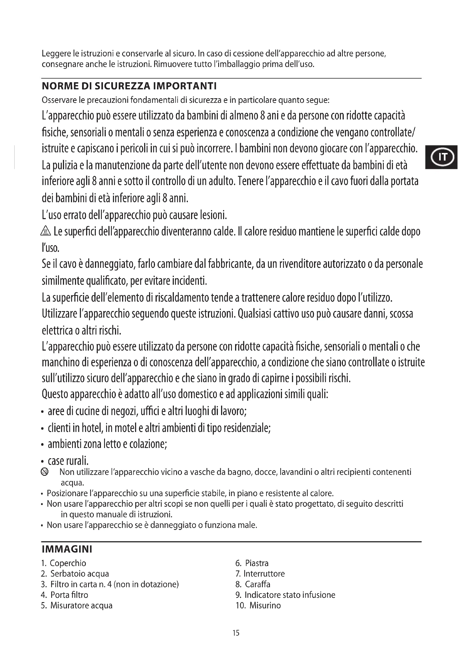 Osservare le precauzioni fondamentali di sicurezza e in particolare quanto segue: L’apparecchio può essere utilizzato da bambini di almeno 8 ani e da persone con ridotte capacità fisiche, sensoriali o mentali o senza esperienza e conoscenza a condizione che vengano controllate/ istruite e capiscano i pericoli in cui si può incorrere. I bambini non devono giocare con l’apparecchio. La pulizia e la manutenzione da parte dell’utente non devono essere effettuate da bambini di età inferiore agli 8 anni e sotto il controllo di un adulto. Tenere l’apparecchio e il cavo fuori dalla portata dei bambini di età inferiore agli 8 anni. L’uso errato dell’apparecchio può causare lesioni. h Le superfici dell’apparecchio diventeranno calde. Il calore residuo mantiene le superfici calde dopo l’uso. Se il cavo è danneggiato, farlo cambiare dal fabbricante, da un rivenditore autorizzato o da personale similmente qualificato, per evitare incidenti. La superficie dell’elemento di riscaldamento tende a trattenere calore residuo dopo l’utilizzo. Utilizzare l’apparecchio seguendo queste istruzioni. Qualsiasi cattivo uso può causare danni, scossa elettrica o altri rischi. L’apparecchio può essere utilizzato da persone con ridotte capacità fisiche, sensoriali o mentali o che manchino di esperienza o di conoscenza dell’apparecchio, a condizione che siano controllate o istruite sull’utilizzo sicuro dell’apparecchio e che siano in grado di capirne i possibili rischi. Questo apparecchio è adatto all’uso domestico e ad applicazioni simili quali: