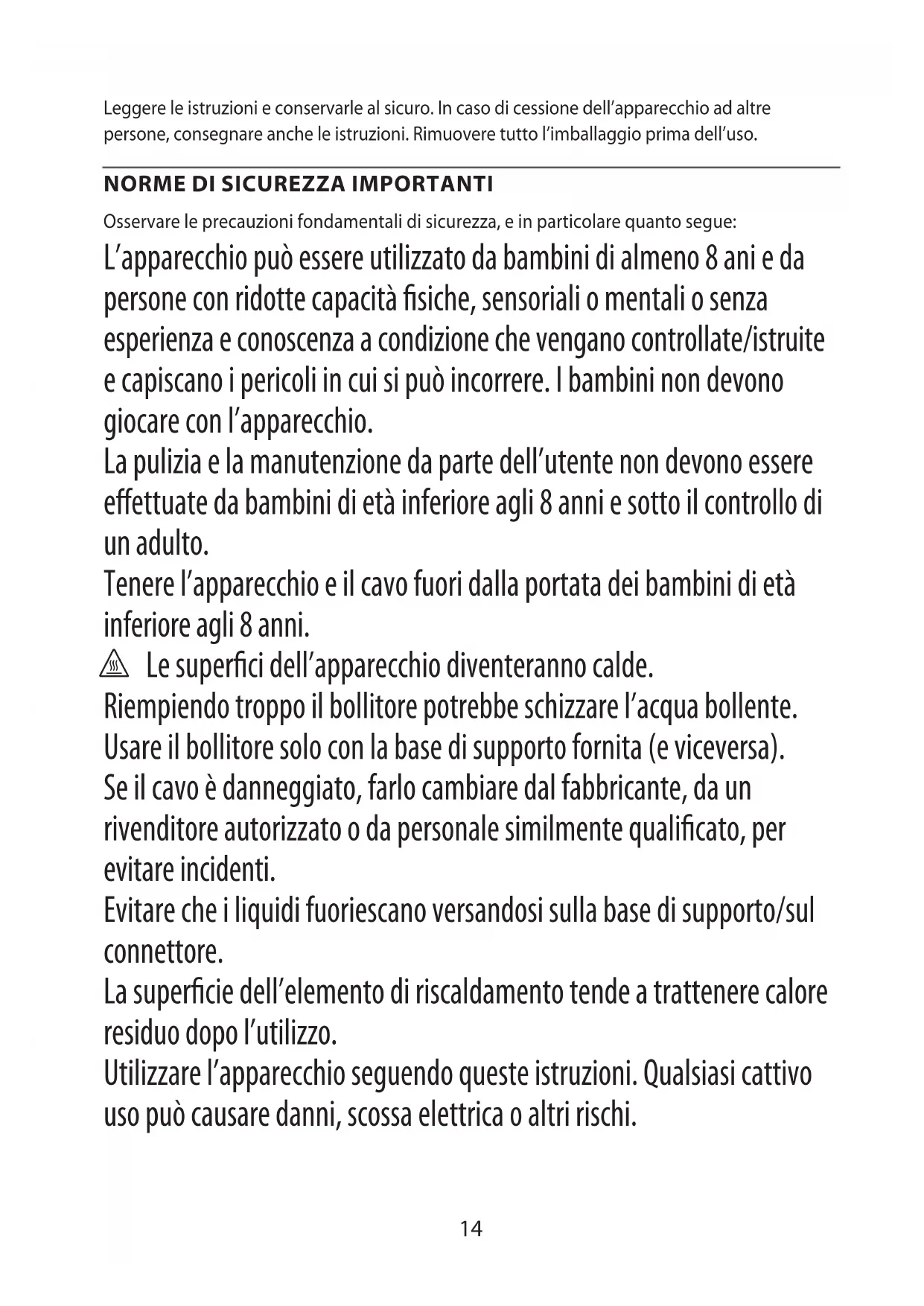 Osservare le precauzioni fondamentali di sicurezza, e in particolare quanto segue: L’apparecchio può essere utilizzato da bambini di almeno 8 ani e da persone con ridotte capacità siche, sensoriali o mentali o senza esperienza e conoscenza a condizione che vengano controllate/istruite e capiscano i pericoli in cui si può incorrere. I bambini non devono giocare con l’apparecchio. La pulizia e la manutenzione da parte dell’utente non devono essere eettuate da bambini di età inferiore agli 8 anni e sotto il controllo di un adulto. Tenere l’apparecchio e il cavo fuori dalla portata dei bambini di età inferiore agli 8 anni. h Le superci dell’apparecchio diventeranno calde. Riempiendo troppo il bollitore potrebbe schizzare l’acqua bollente. Usare il bollitore solo con la base di supporto fornita (e viceversa). Se il cavo è danneggiato, farlo cambiare dal fabbricante, da un rivenditore autorizzato o da personale similmente qualicato, per evitare incidenti. Evitare che i liquidi fuoriescano versandosi sulla base di supporto/sul connettore. La supercie dell’elemento di riscaldamento tende a trattenere calore residuo dopo l’utilizzo. Utilizzare l’apparecchio seguendo queste istruzioni. Qualsiasi cattivo uso può causare danni, scossa elettrica o altri rischi.15 L’apparecchio può essere utilizzato da persone con ridotte capacità siche, sensoriali o mentali o che manchino di esperienza o di conoscenza dell’apparecchio, a condizione che siano controllate o istruite sull’utilizzo sicuro dell’apparecchio e che siano in grado di capirne i possibili rischi. Questo apparecchio è adatto all’uso domestico e ad applicazioni simili quali: