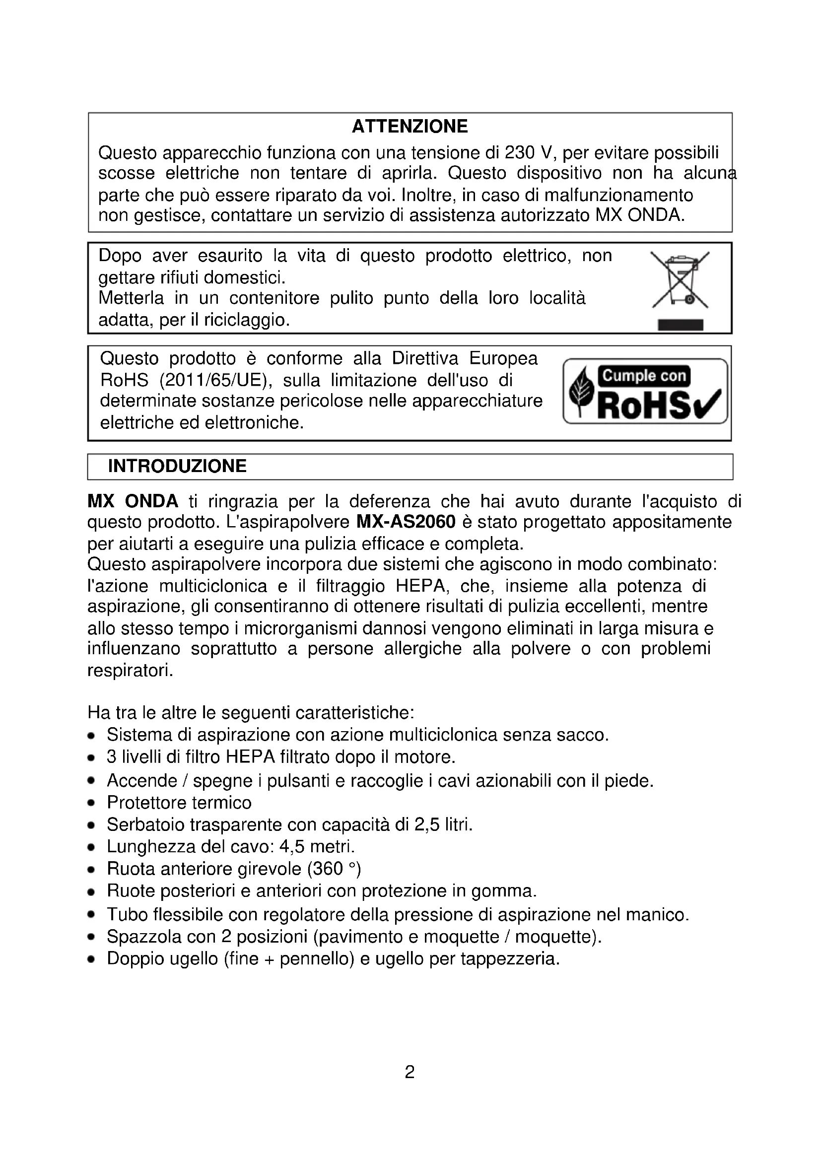 Questo prodotto è conforme alla Direttiva Europea RoHS (2011/65/UE), sulla limitazione dell'uso di determinate sostanze pericolose nelle apparecchiature elettriche ed elettroniche. INTRODUZIONE MX ONDA ti ringrazia per la deferenza che hai avuto durante l'acquisto di questo prodotto. L'aspirapolvere MX-AS2060 è stato progettato appositamente per aiutarti a eseguire una pulizia efficace e completa. Questo aspirapolvere incorpora due sistemi che agiscono in modo combinato: l'azione multiciclonica e il filtraggio HEPA, che, insieme alla potenza di aspirazione, gli consentiranno di ottenere risultati di pulizia eccellenti, mentre allo stesso tempo i microrganismi dannosi vengono eliminati in larga misura e influenzano soprattutto a persone allergiche alla polvere o con problemi respiratori. Ha tra le altre le seguenti caratteristiche: Sistema di aspirazione con azione multiciclonica senza sacco. 3 livelli di filtro HEPA filtrato dopo il motore. Accende / spegne i pulsanti e raccoglie i cavi azionabili con il piede. Protettore termico Serbatoio trasparente con capacità di 2,5 litri. Lunghezza del cavo: 4,5 metri. Ruota anteriore girevole (360 °) Ruote posteriori e anteriori con protezione in gomma. Tubo flessibile con regolatore della pressione di aspirazione nel manico. Spazzola con 2 posizioni (pavimento e moquette / moquette). Doppio ugello (fine + pennello) e ugello per tappezzeria.