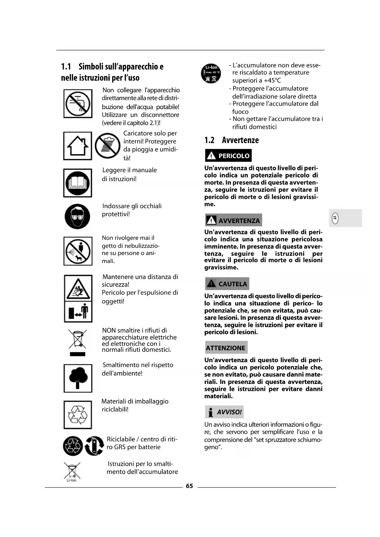 AVVERTENZA Un’avvertenza di questo livello di peri- colo indica una situazione pericolosa imminente. In presenza di questa avver- tenza, seguire le istruzioni per evitare il pericolo di morte o di lesioni gravissime. CAUTELA Un’avvertenza di questo livello di perico- lo indica una situazione di perico- lo potenziale che, se non evitata, può cau- sare lesioni. In presenza di questa avver- tenza, seguire le istruzioni per evitare il pericolo di lesioni. ATTENZIONE Un’avvertenza di questo livello di peri- colo indica un pericolo potenziale che, se non evitato, può causare danni mate- riali. In presenza di questa avvertenza, seguire le istruzioni per evitare danni materiali. AVVISO! Un avviso indica ulteriori informazioni o figu- re, che servono per semplificare l’uso e la comprensione del “set spruzzatore schiumo- geno“. Li-Ion max. 45 °C MULTIJET.qxp_Text_IT 06.01.20 15:51 Seite 6566