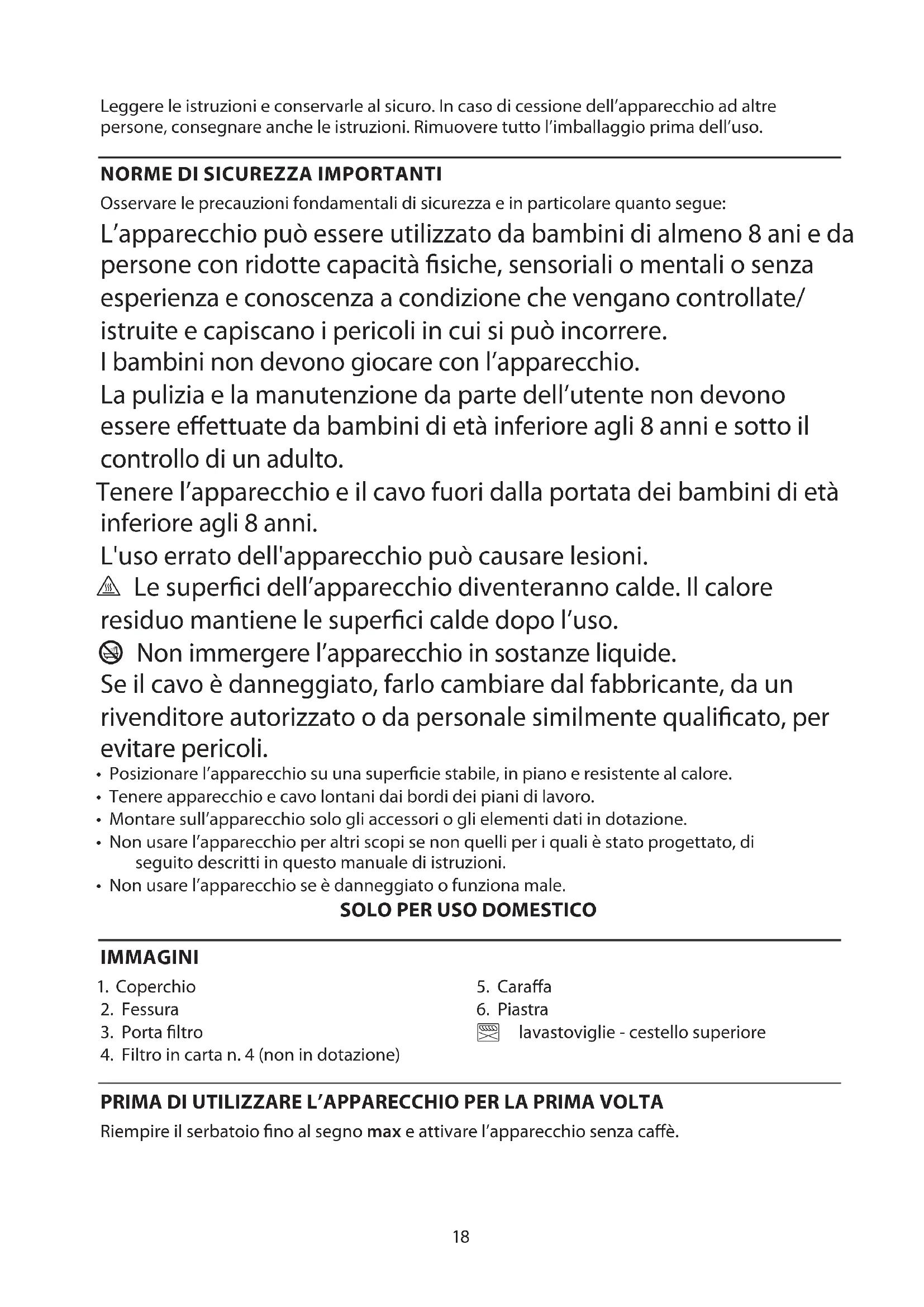 Osservare le precauzioni fondamentali di sicurezza e in particolare quanto segue: L’apparecchio può essere utilizzato da bambini di almeno 8 ani e da persone con ridotte capacità siche, sensoriali o mentali o senza esperienza e conoscenza a condizione che vengano controllate/ istruite e capiscano i pericoli in cui si può incorrere. I bambini non devono giocare con l’apparecchio. La pulizia e la manutenzione da parte dell’utente non devono essere eettuate da bambini di età inferiore agli 8 anni e sotto il controllo di un adulto. Tenere l’apparecchio e il cavo fuori dalla portata dei bambini di età inferiore agli 8 anni. L'uso errato dell'apparecchio può causare lesioni. h Le superci dell’apparecchio diventeranno calde. Il calore residuo mantiene le superci calde dopo l’uso. b Non immergere l’apparecchio in sostanze liquide. Se il cavo è danneggiato, farlo cambiare dal fabbricante, da un rivenditore autorizzato o da personale similmente qualicato, per evitare pericoli.