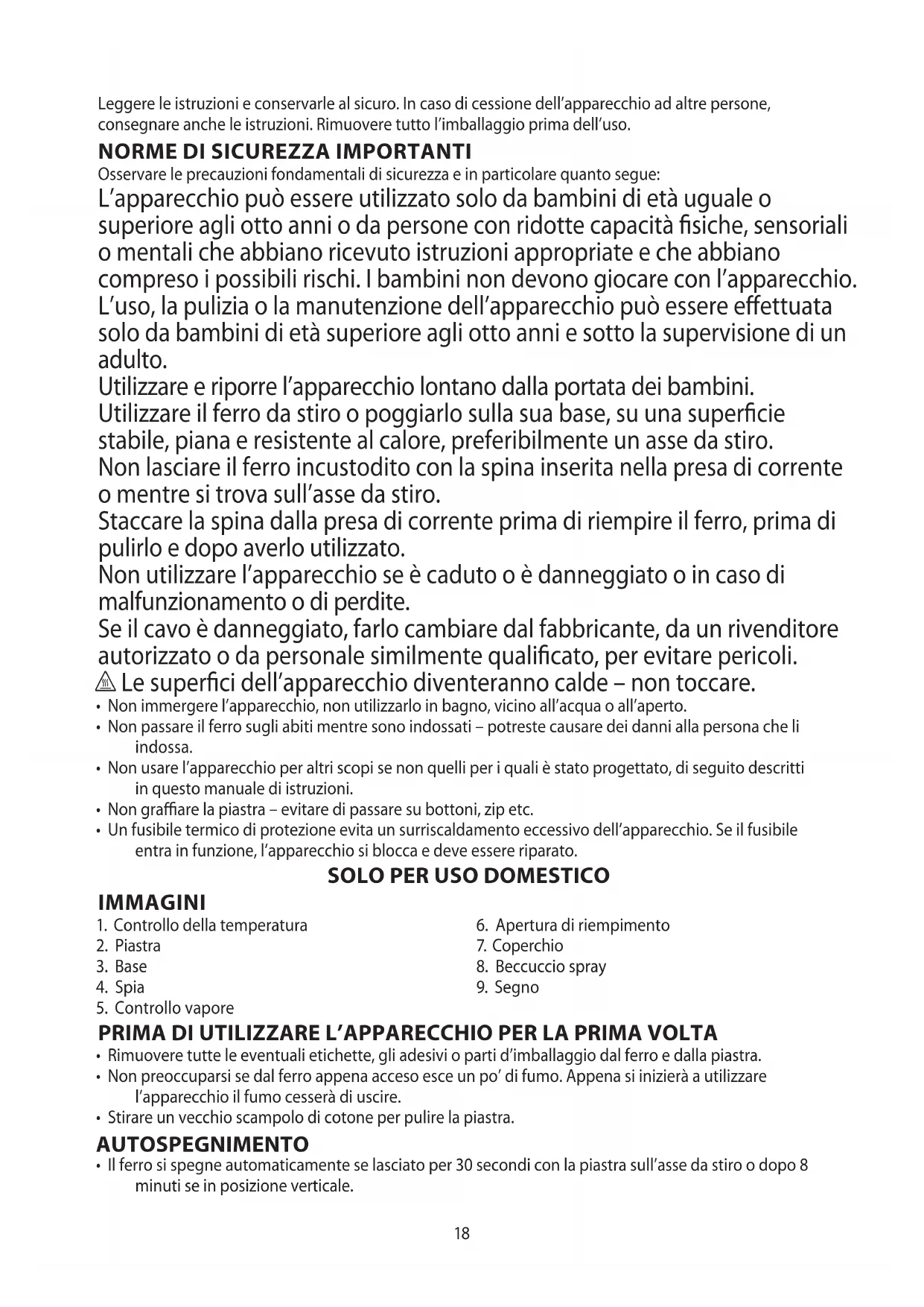 Osservare le precauzioni fondamentali di sicurezza e in particolare quanto segue: L’apparecchio può essere utilizzato solo da bambini di età uguale o superiore agli otto anni o da persone con ridotte capacità fisiche, sensoriali o mentali che abbiano ricevuto istruzioni appropriate e che abbiano compreso i possibili rischi. I bambini non devono giocare con l’apparecchio. L’uso, la pulizia o la manutenzione dell’apparecchio può essere effettuata solo da bambini di età superiore agli otto anni e sotto la supervisione di un adulto. Utilizzare e riporre l’apparecchio lontano dalla portata dei bambini. Utilizzare il ferro da stiro o poggiarlo sulla sua base, su una superficie stabile, piana e resistente al calore, preferibilmente un asse da stiro. Non lasciare il ferro incustodito con la spina inserita nella presa di corrente o mentre si trova sull’asse da stiro. Staccare la spina dalla presa di corrente prima di riempire il ferro, prima di pulirlo e dopo averlo utilizzato. Non utilizzare l’apparecchio se è caduto o è danneggiato o in caso di malfunzionamento o di perdite. Se il cavo è danneggiato, farlo cambiare dal fabbricante, da un rivenditore autorizzato o da personale similmente qualificato, per evitare pericoli. h Le superfici dell’apparecchio diventeranno calde – non toccare.