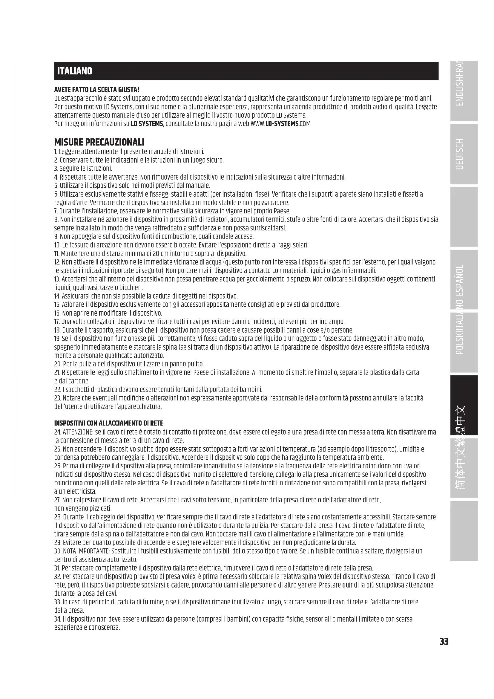 ITALIANO AVETE FATTO LA SCELTA GIUSTA! Quest‘apparecchio è stato sviluppato e prodotto secondo elevati standard qualitativi che garantiscono un funzionamento regolare per molti anni. Per questo motivo LD Systems, con il suo nome e la pluriennale esperienza, rappresenta un‘azienda produttrice di prodotti audio di qualità. Leggete attentamente questo manuale d‘uso per utilizzare al meglio il vostro nuovo prodotto LD Systems. Per maggiori informazioni su LD SYSTEMS, consultate la nostra pagina web WWW.LD-SYSTEMS.COM MISURE PRECAUZIONALI