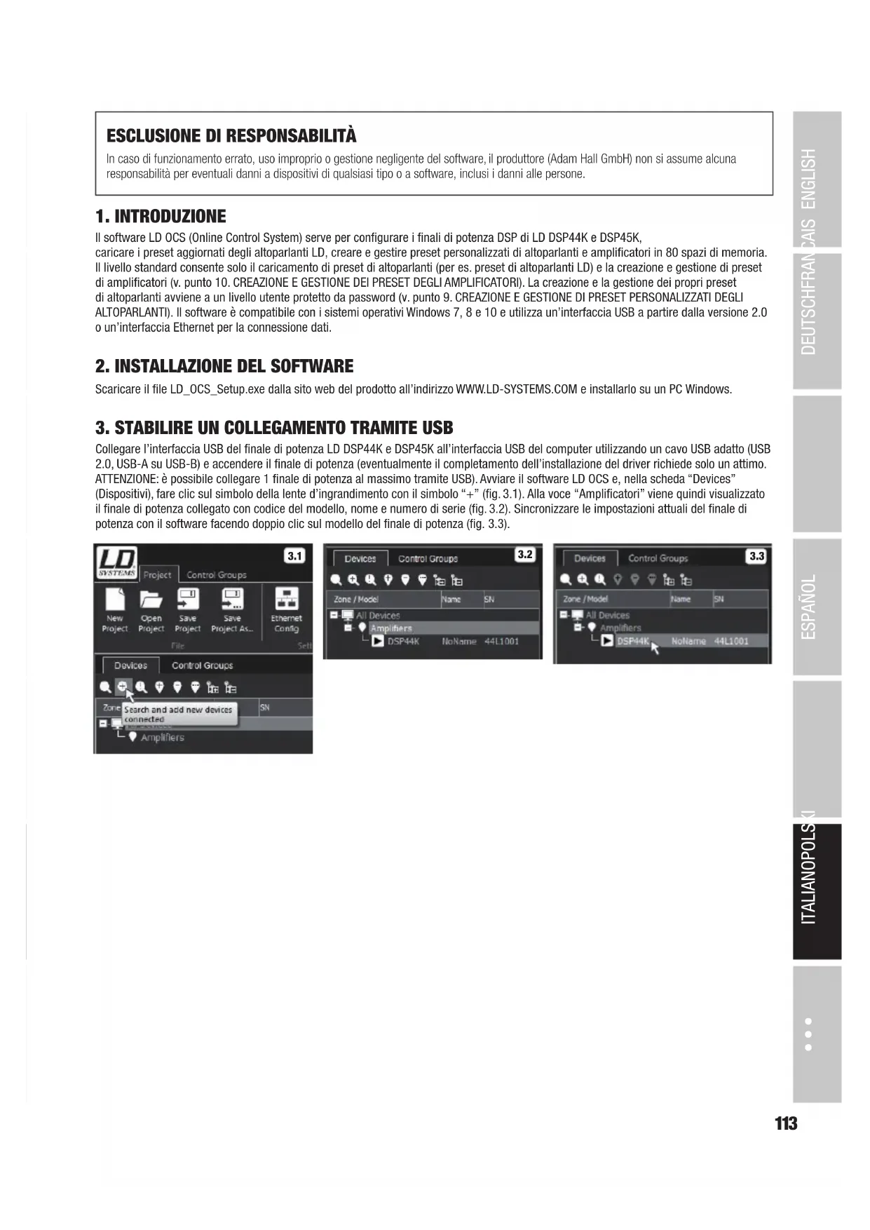 Collegare l’interfaccia USB del finale di potenza LD DSP44K e DSP45K all’interfaccia USB del computer utilizzando un cavo USB adatto (USB 2.0, USB-A su USB-B) e accendere il finale di potenza (eventualmente il completamento dell’installazione del driver richiede solo un attimo. ATTENZIONE: è possibile collegare 1 finale di potenza al massimo tramite USB). Avviare il software LD OCS e, nella scheda “Devices” (Dispositivi), fare clic sul simbolo della lente d’ingrandimento con il simbolo “+” (fig. 3.1). Alla voce “Amplificatori” viene quindi visualizzato il finale di potenza collegato con codice del modello, nome e numero di serie (fig. 3.2). Sincronizzare le impostazioni attuali del finale di potenza con il software facendo doppio clic sul modello del finale di potenza (fig. 3.3).