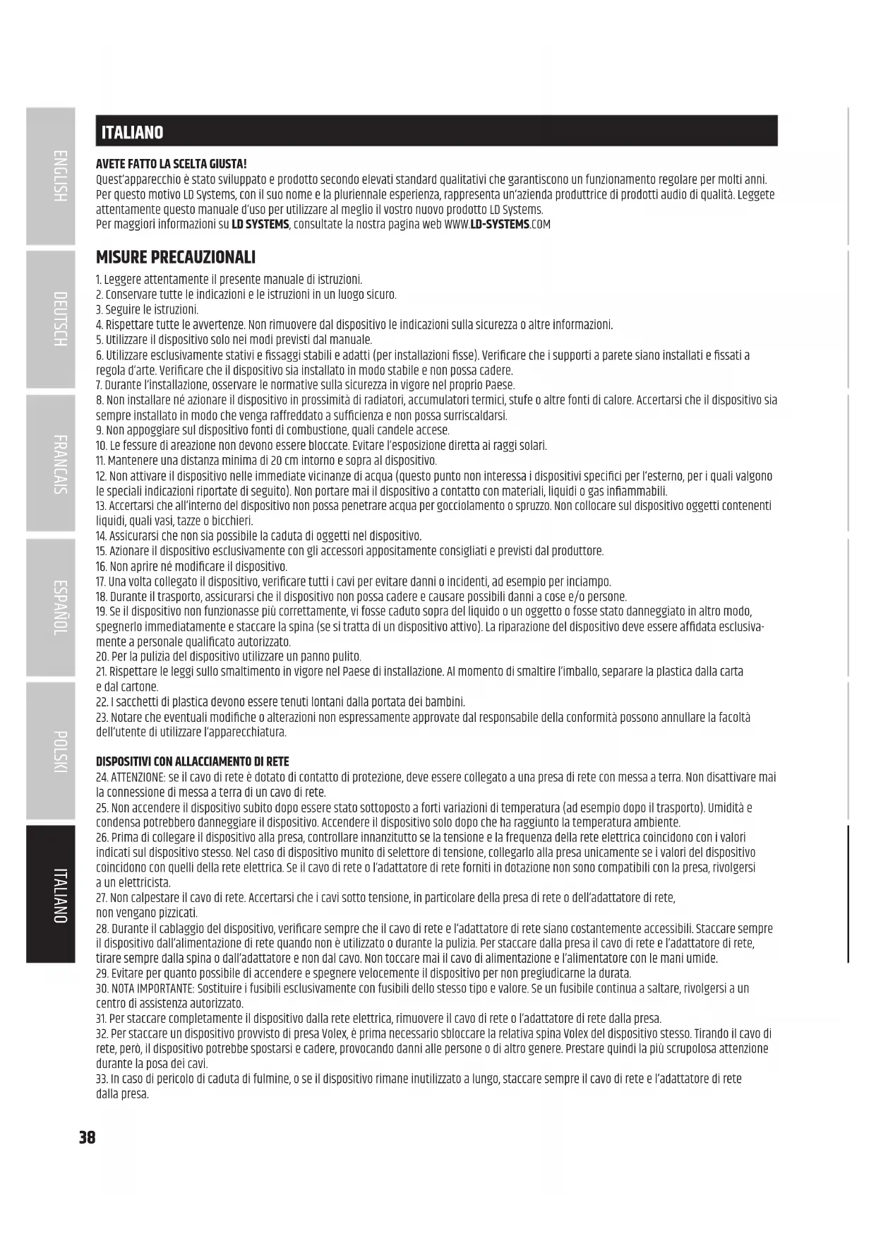 30. NOTA IMPORTANTE: Sostituire i fusibili esclusivamente con fusibili dello stesso tipo e valore. Se un fusibile continua a saltare, rivolgersi a un centro di assistenza autorizzato. 31. Per staccare completamente il dispositivo dalla rete elettrica, rimuovere il cavo di rete o l‘adattatore di rete dalla presa. 32. Per staccare un dispositivo provvisto di presa Volex, è prima necessario sbloccare la relativa spina Volex del dispositivo stesso. Tirando il cavo di rete, però, il dispositivo potrebbe spostarsi e cadere, provocando danni alle persone o di altro genere. Prestare quindi la più scrupolosa attenzione durante la posa dei cavi. 33. In caso di pericolo di caduta di fulmine, o se il dispositivo rimane inutilizzato a lungo, staccare sempre il cavo di rete e l‘adattatore di rete dalla presa.39 DEUTSCHFRANCAIS ESPAÑOL ENGLISH ITALIANO POLSKI 34. Il dispositivo non deve essere utilizzato da persone (compresi i bambini) con capacità siche, sensoriali o mentali limitate o con scarsa esperienza e conoscenza.