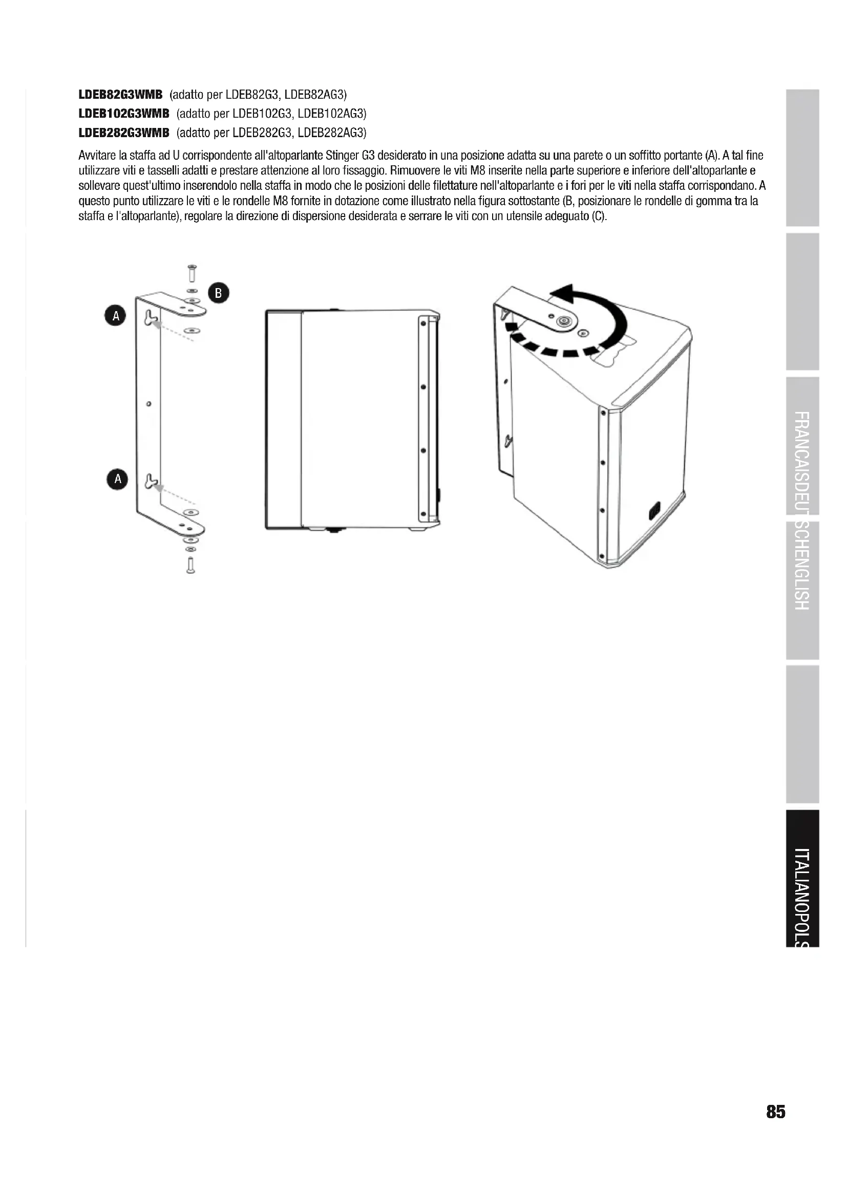 LDEB82G3WMB (adatto per LDEB82G3, LDEB82AG3) LDEB102G3WMB (adatto per LDEB102G3, LDEB102AG3) LDEB282G3WMB (adatto per LDEB282G3, LDEB282AG3) Avvitare la staffa ad U corrispondente all'altoparlante Stinger G3 desiderato in una posizione adatta su una parete o un soffitto portante (A). A tal fine utilizzare viti e tasselli adatti e prestare attenzione al loro fissaggio. Rimuovere le viti M8 inserite nella parte superiore e inferiore dell'altoparlante e sollevare quest'ultimo inserendolo nella staffa in modo che le posizioni delle filettature nell'altoparlante e i fori per le viti nella staffa corrispondano. A questo punto utilizzare le viti e le rondelle M8 fornite in dotazione come illustrato nella figura sottostante (B, posizionare le rondelle di gomma tra la staffa e l'altoparlante), regolare la direzione di dispersione desiderata e serrare le viti con un utensile adeguato (C). ITALIANOPOLSKIESPAÑOL FRANCAISDEUTSCHENGLISH 85A