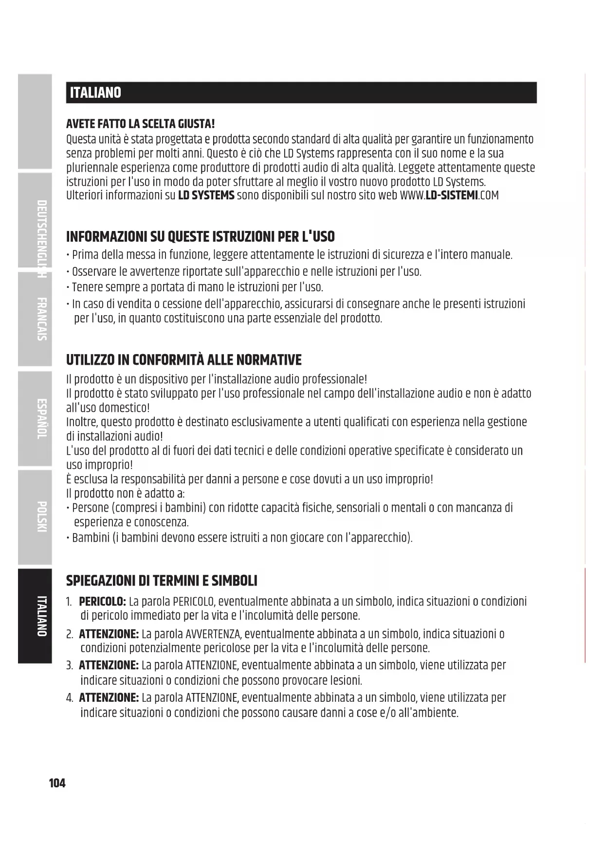 Firma Adam Hall GmbH niniejszym oświadcza, że ten typ urządzenia radiowego jest zgodny z dyrektywą 2014/53/UE. Pełny tekst deklaracji zgodności UE można znaleźć pod adresem Dostępny adres internetowy: www.adamhall.com/compliance/ DEUTSCHFRANCAIS ESPAÑOL ENGLISH ITALIANO POLSKI104 ITALIANO AVETE FATTO LA SCELTA GIUSTA! Questa unità è stata progettata e prodotta secondo standard di alta qualità per garantire un funzionamento senza problemi per molti anni. Questo è ciò che LD Systems rappresenta con il suo nome e la sua pluriennale esperienza come produttore di prodotti audio di alta qualità. Leggete attentamente queste istruzioni per l'uso in modo da poter sfruttare al meglio il vostro nuovo prodotto LD Systems. Ulteriori informazioni su LD SYSTEMS sono disponibili sul nostro sito web WWW.LD-SISTEMI.COM