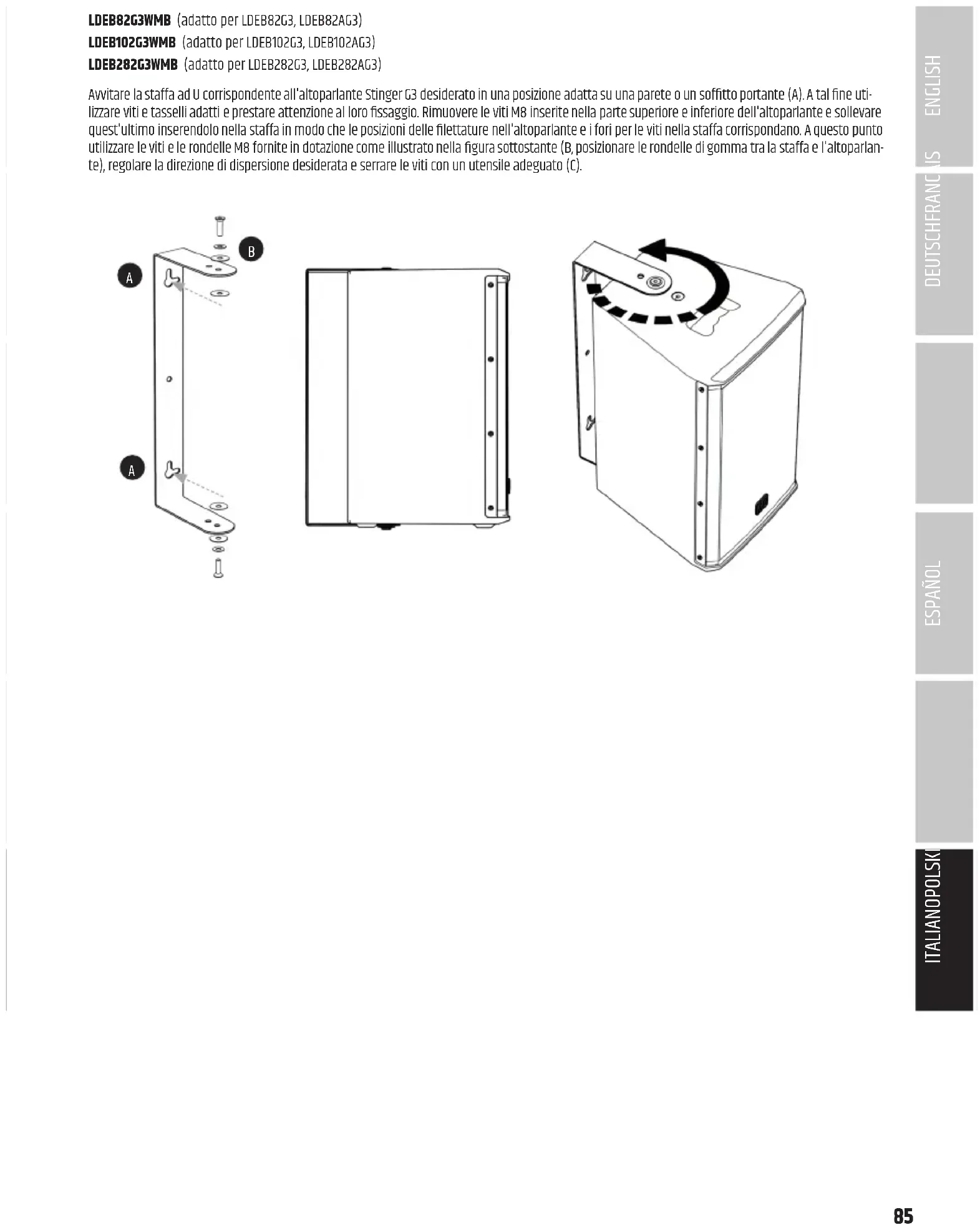 LDEBG3WMB (adatto per LDEB122G3, LDEB122AG3, LDEB152G3, LDEB152AG3) Avvitare la staffa ad U corrispondente all’altoparlante Stinger G3 desiderato in una posizione adatta su una parete portante (A). A tal ne utilizzare viti e tasselli adatti e prestare attenzione al loro ssaggio. Rimuovere le viti M8 inserite nella parte superiore e inferiore dell’altoparlante e sollevare quest’ultimo inserendolo nella staffa in modo che le posizioni delle lettature nell’altoparlante e i fori per le viti nella staffa corrispondano. A questo punto utilizzare le viti e le rondelle M8 fornite in dotazione come illustrato nella gura sottostante (B, posizionare le rondelle di gomma tra la staffa e l’altoparlante), regolare la direzione di dispersione desiderata e serrare le viti con un utensile adeguato (C).A questo punto regolare il lato regolabile della staffa in base alle dimensioni dell'altoparlante e bloccarlo in posizione con le due viti sul lato della staffa (D). Utilizzare il galletto M10 in dotazione per ssare l'altoparlante sulla staffa nell'angolo desiderato, nella posizione corrispondente al perno ad innesto (E, posizionare la rondella in gomma fornita tra staffa e altoparlante, per l'installazione permanente è fornita una vite esagonale M10). Per il montaggio su traversa sono previsti dei fori per i morsetti per tralicci nelle posizioni corrispondenti alle dimensioni dell'altoparlante (F).