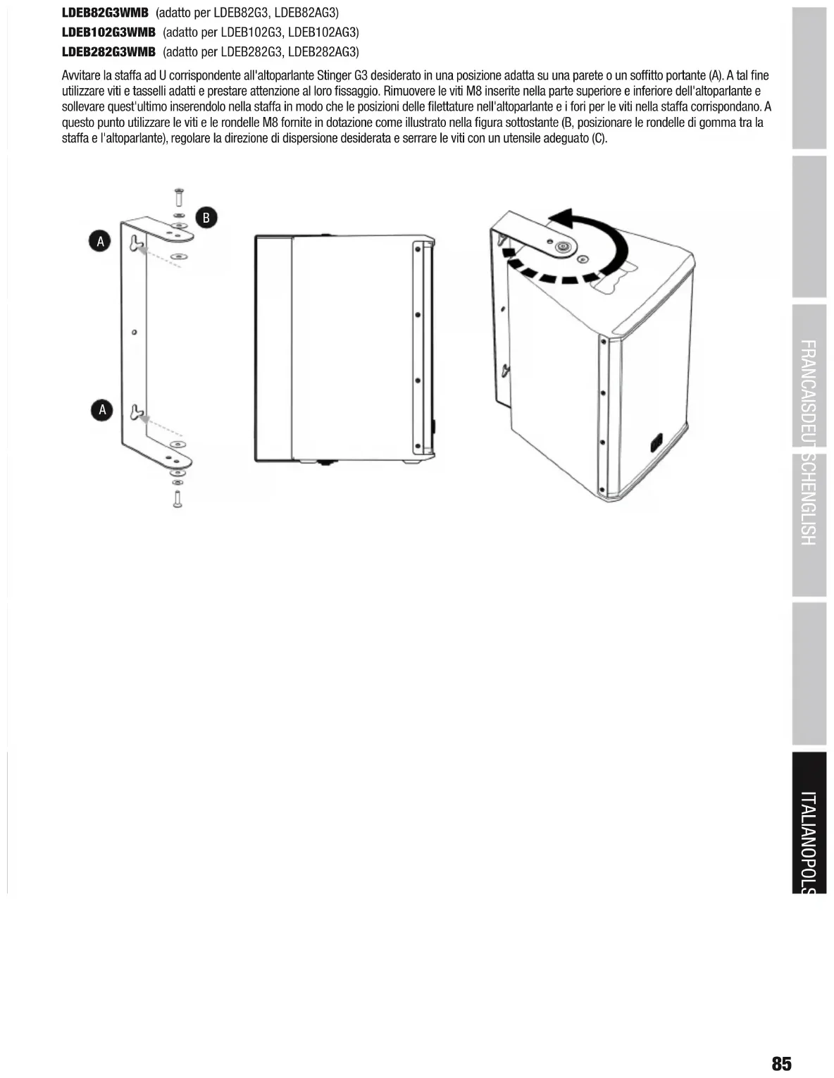 LDEB82G3WMB (adatto per LDEB82G3, LDEB82AG3) LDEB102G3WMB (adatto per LDEB102G3, LDEB102AG3) LDEB282G3WMB (adatto per LDEB282G3, LDEB282AG3) Avvitare la staffa ad U corrispondente all'altoparlante Stinger G3 desiderato in una posizione adatta su una parete o un soffitto portante (A). A tal fine utilizzare viti e tasselli adatti e prestare attenzione al loro fissaggio. Rimuovere le viti M8 inserite nella parte superiore e inferiore dell'altoparlante e sollevare quest'ultimo inserendolo nella staffa in modo che le posizioni delle filettature nell'altoparlante e i fori per le viti nella staffa corrispondano. A questo punto utilizzare le viti e le rondelle M8 fornite in dotazione come illustrato nella figura sottostante (B, posizionare le rondelle di gomma tra la staffa e l'altoparlante), regolare la direzione di dispersione desiderata e serrare le viti con un utensile adeguato (C). ITALIANOPOLSKIESPAÑOL FRANCAISDEUTSCHENGLISH 85A